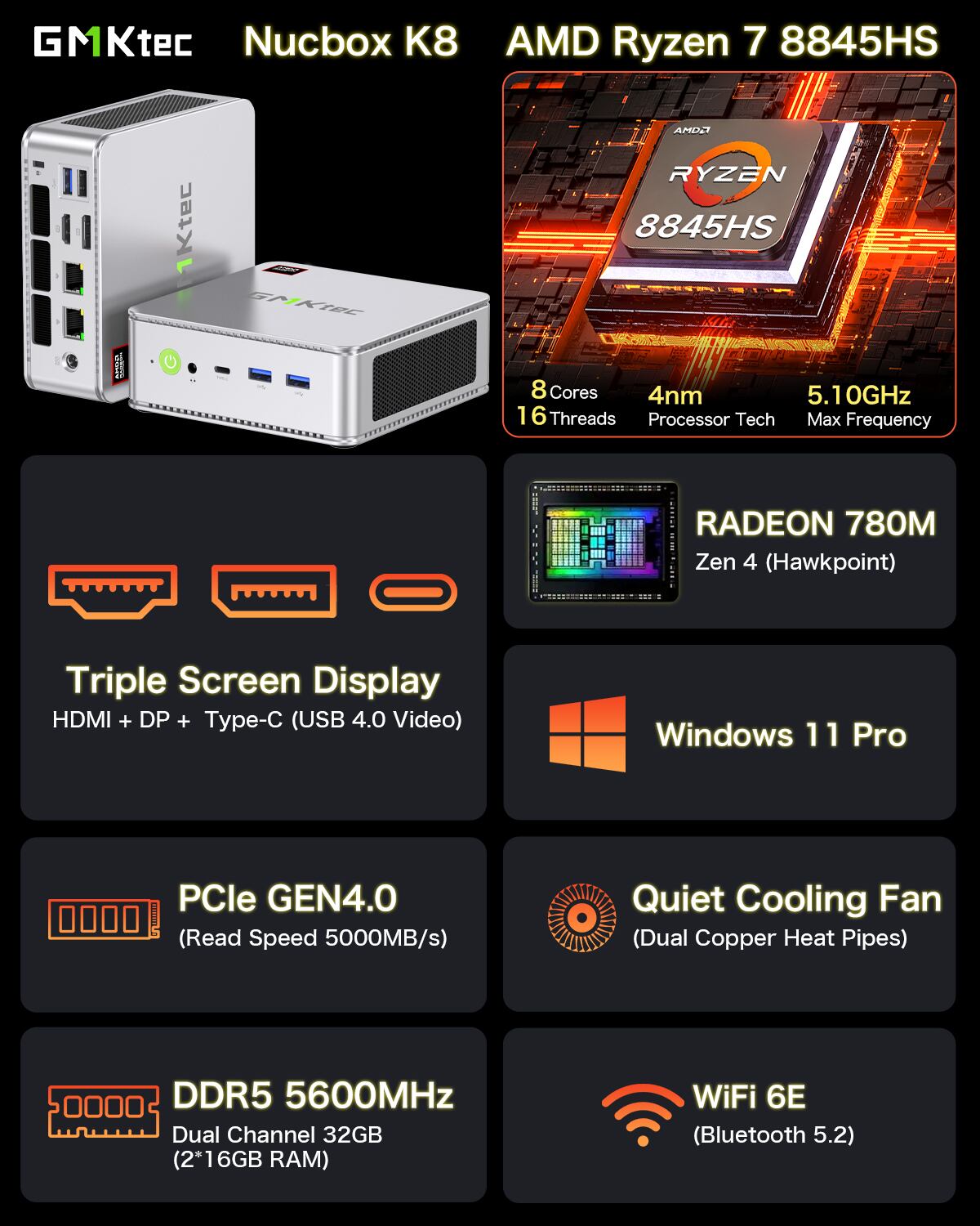 Gmktec-トリプルスクリーンディスプレイ付きミニゲーミングpc、Windows 11、ddr5、5600mhz、pcie4.0、nvme、ssd、