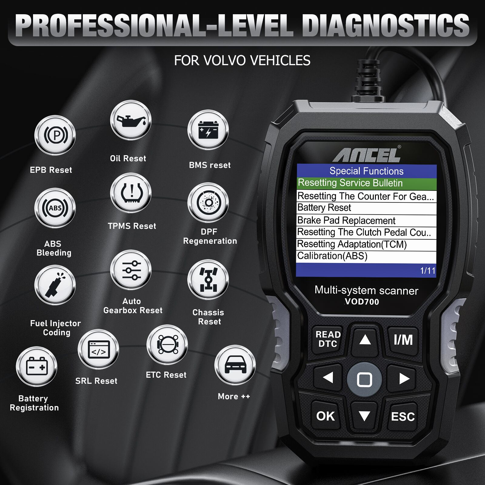 ボルボ車ユーザーに朗報です!ANCEL-VOD700自動車診断ツールが遂に登場しました。全システムの診断障害コードを読み取り、解除するだけでなく、エンジンやトランスミッションなどのすべての制御モジュールをサポートします。11言語対応で、複数の車両に対応し、オイルリセットやエアバッグシステムの診断も可能です。貴重な時間と費用を節約しながら、車のメンテナンスを効率的に行いましょう。ANCEL-VOD700で安心して車のメンテナンスを行い、走行をさらに快適にお楽しみください。ANCEL-VOD700自動車診断ツール,コードリーダー,OBD2,全システム,インジェクターオイル,ABS,Rl,BMS,EPB,TPMS,D-P-F,リセットAcnelvod700obd2スキャナーは、ボルボ車両用に特別に設計されています。