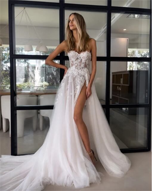 自由奔放に生きるピンツラインウェディングドレス、アップリケ、バックレス、スリット、チュール、デザイナー、2022