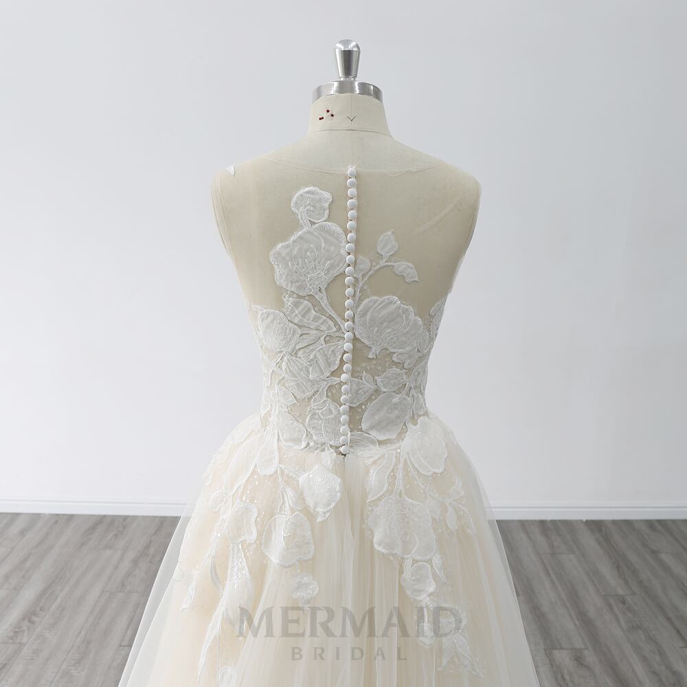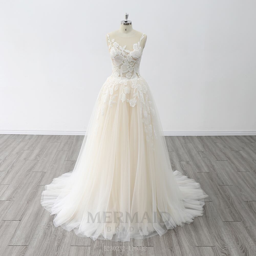錯覚プリーツチュールウェディングドレス、スクープネック、スイープ、ライン