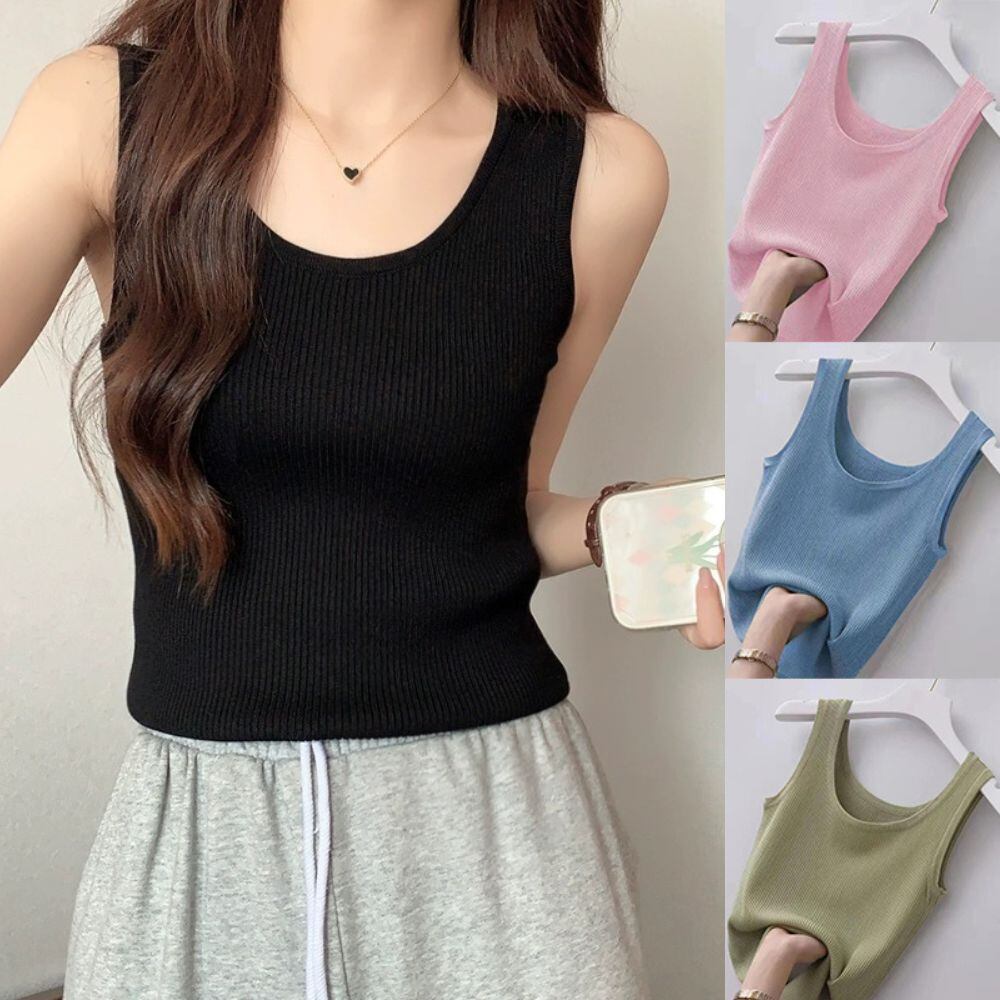 女性用ノースリーブニットタンクトップ,ラウンドネック,ピュアカラートップ,サマーキャミソール,カジュアル,無地,黒,白