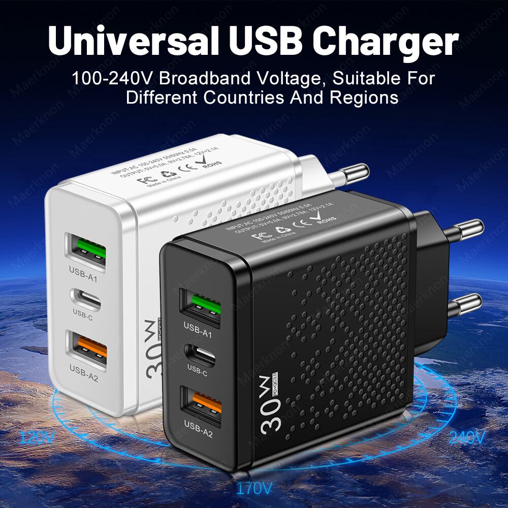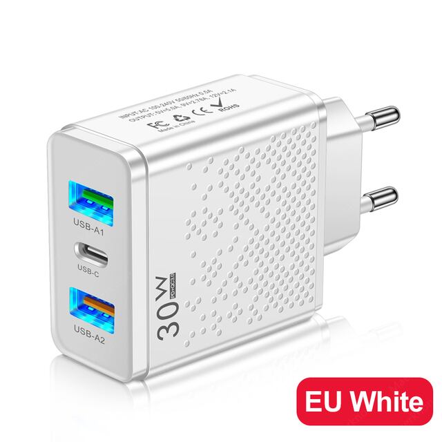 IPhone,Samsung,Huawei,Xiaomi電話用のUSB充電器,3ポート,EU/USアダプター,30W,クイックチャージ3.0