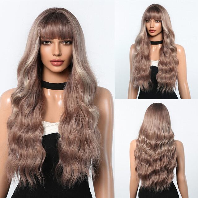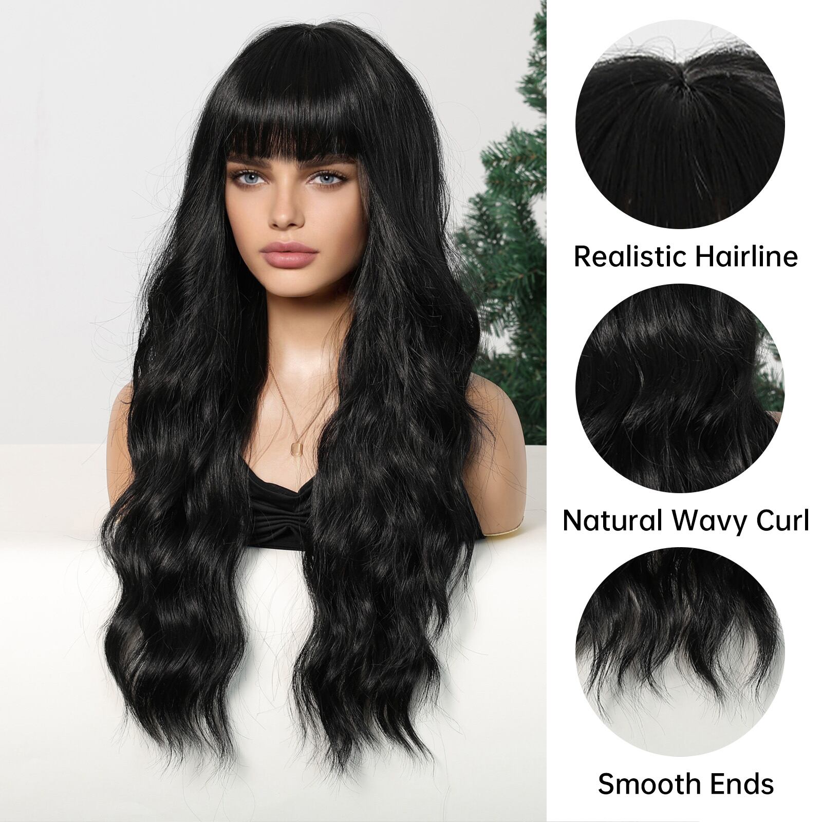 女性のための長い波状の合成かつら、フリンジ付き、自然な黒の髪、耐熱繊維、毎日およびパーティー