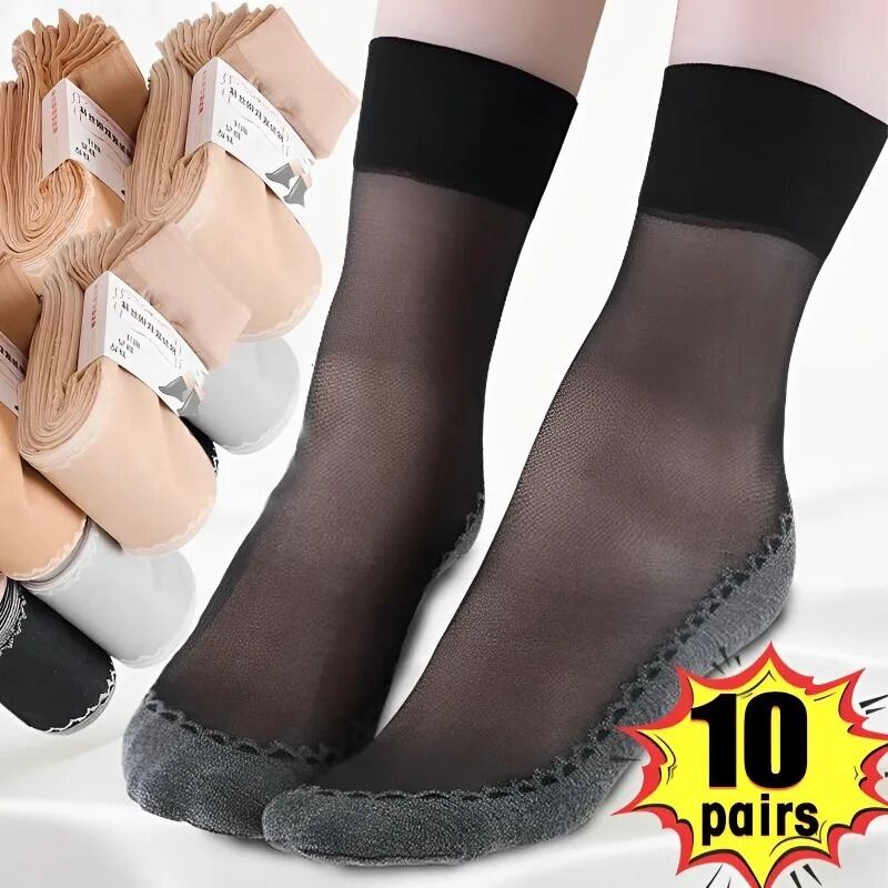 女性用の伸縮性のあるレースソックス,透明,超薄型,滑り止め,ストライプソックス,シルクベルベット,足首までの長さ1 5 10ペア