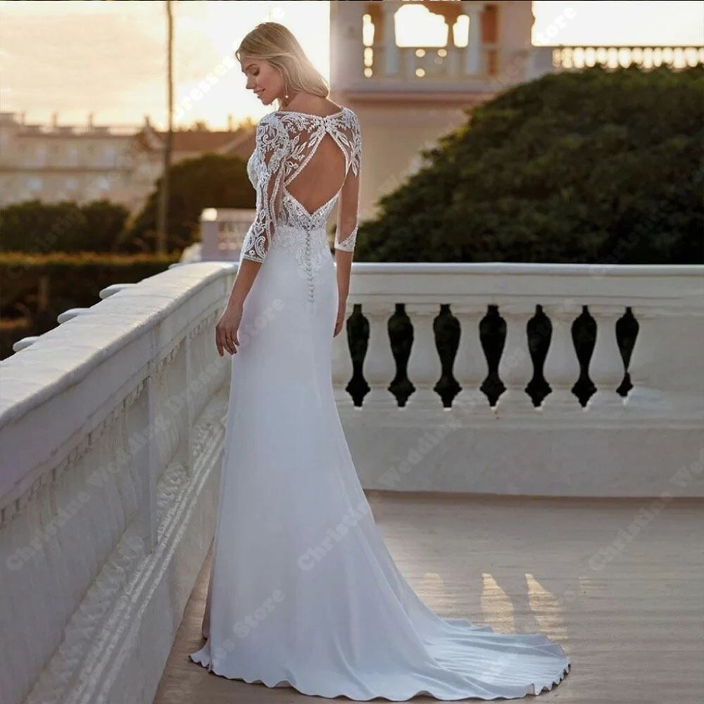 レースアップリケバックレスブライダルガウン女性用、マーメイドウェディングドレス、3クォータースリーブ、ビーチパーティードレス、ホワイト、新品、2022
