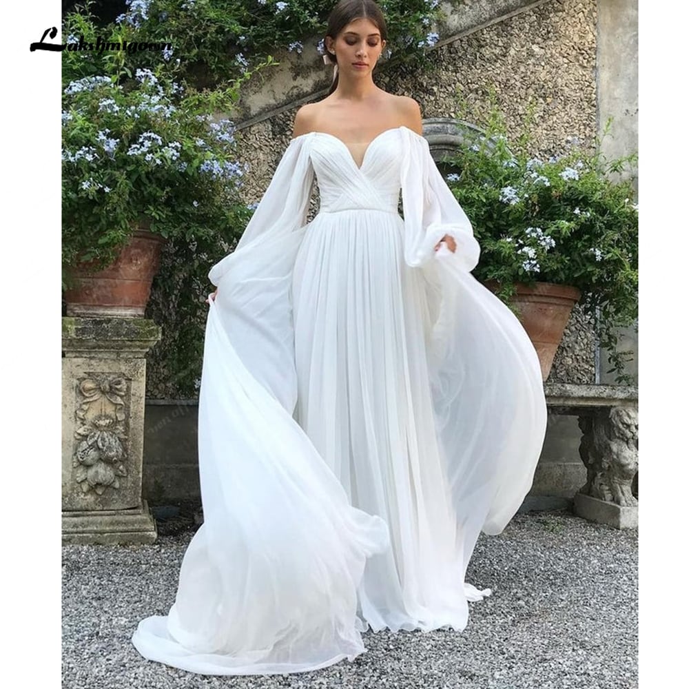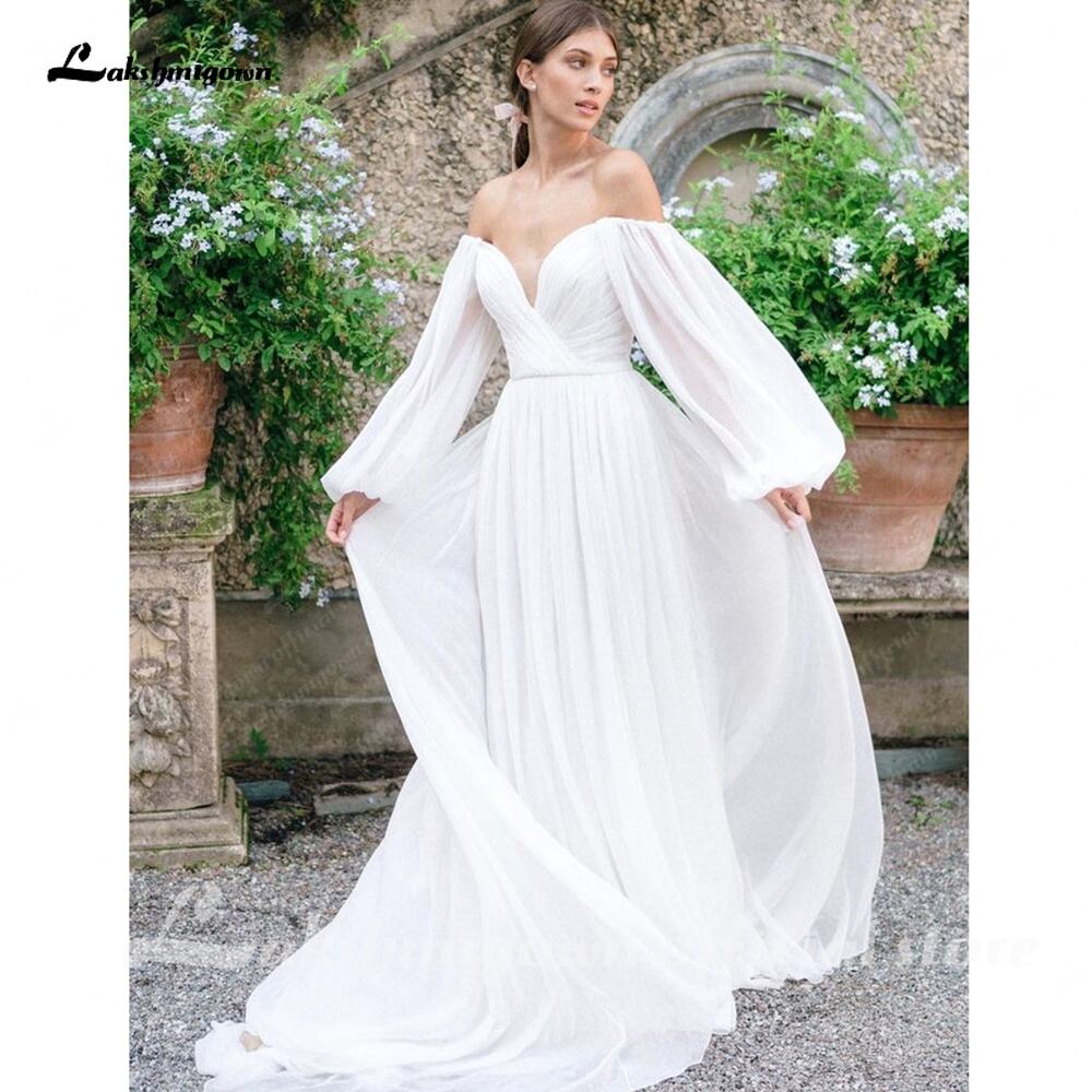 Lokshmigown-Puffyシフォンウェディングドレス、長袖、自由奔放に生きるビーチウェディングドレス、ヴィンテージラインブライダルガウン、バッ