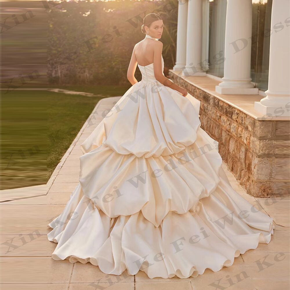 女性のレイヤードウェディングドレス、ノースリーブ、バックレスプリンセス、ブライダルガウン、プリーツ、サテン、フォーマル、ビーチパーティー、セクシー、ゴ