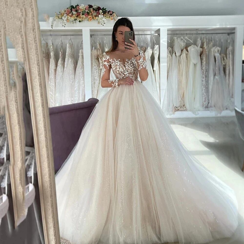 光沢のある長袖ウェディングドレス,シャンパンレース,シャンパンカラー,非常にフェミニン,2023