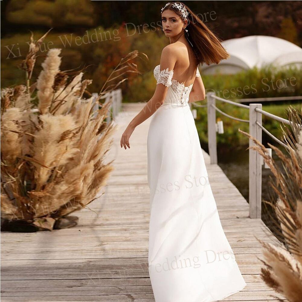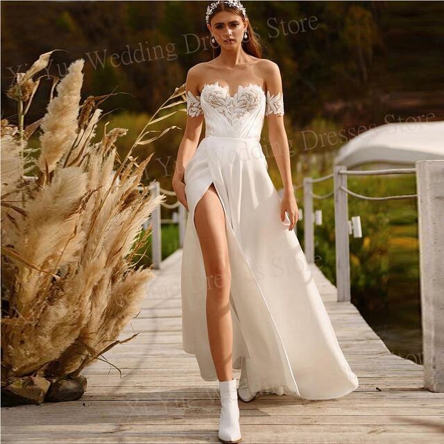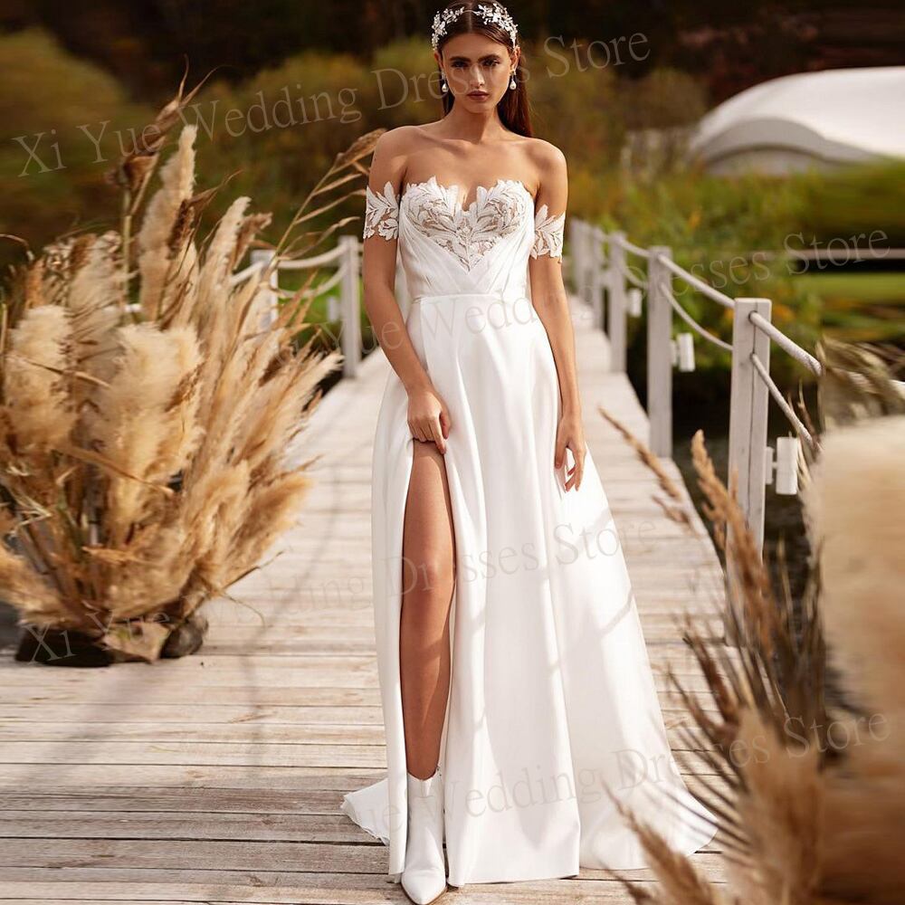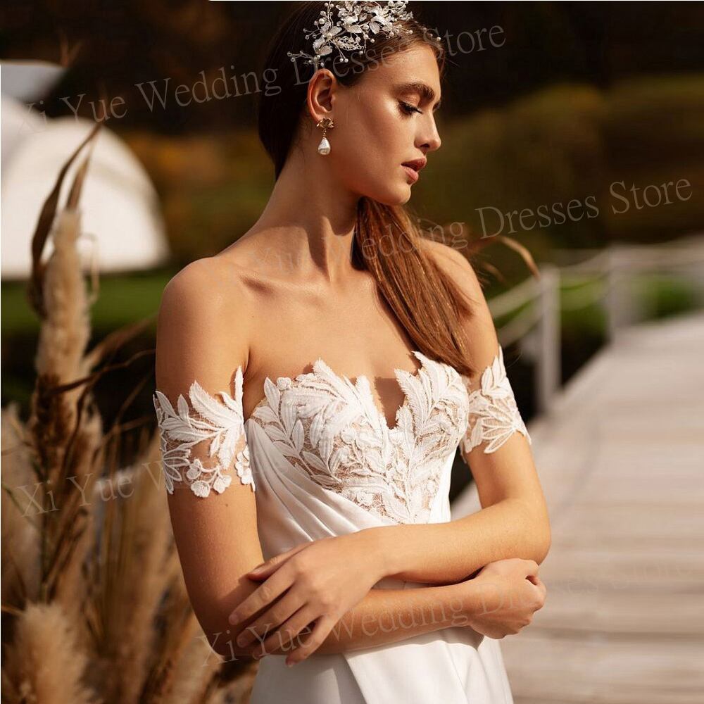 ラインレースのアップリケのウェディングドレス、背中の開いた花嫁のガウン、大きな分割、裸の肩、モダン、シンプル、ピンセット