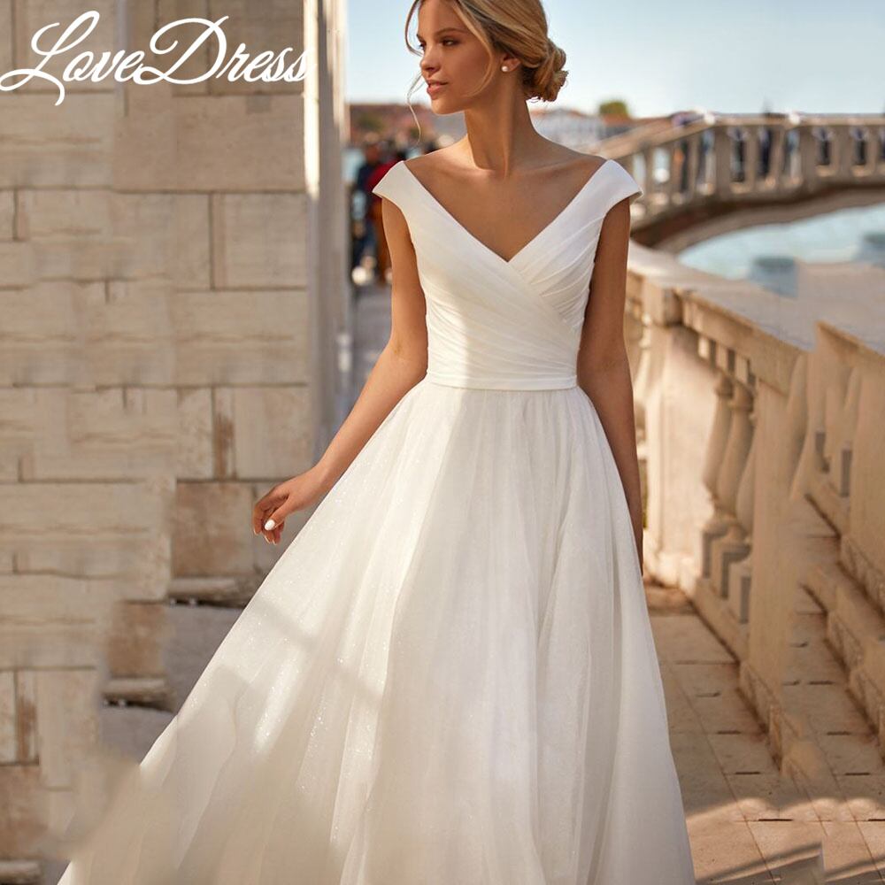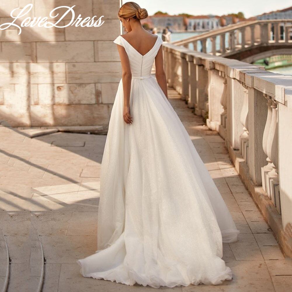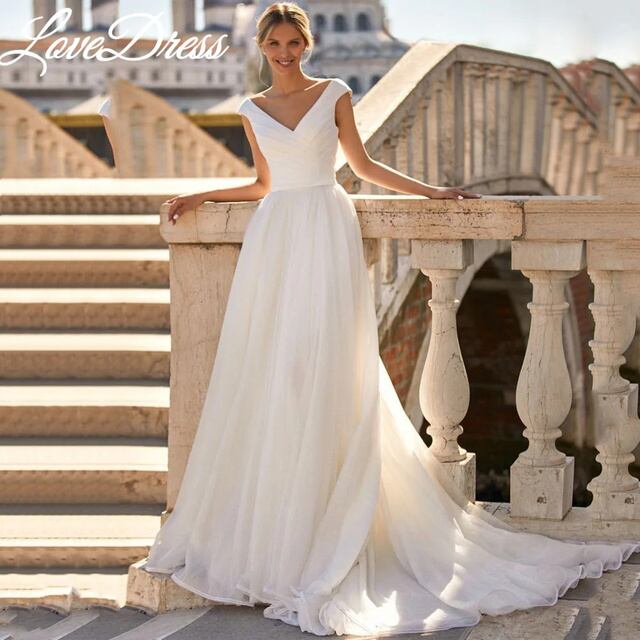 Lovedress Vネックウェディングドレス、ブライダルガウン、台形の電車、オーガンザサテン、キャップスリーブ、プリーツ、ボヘミアン、Aライン