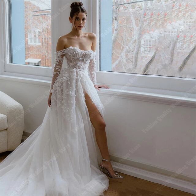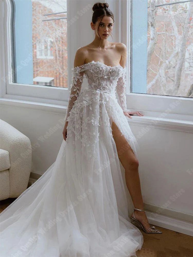 裸の肩のプリンセスAラインのウェディングドレス,光沢のあるチュールの表面,セクシーなネグリジェ,エレガント