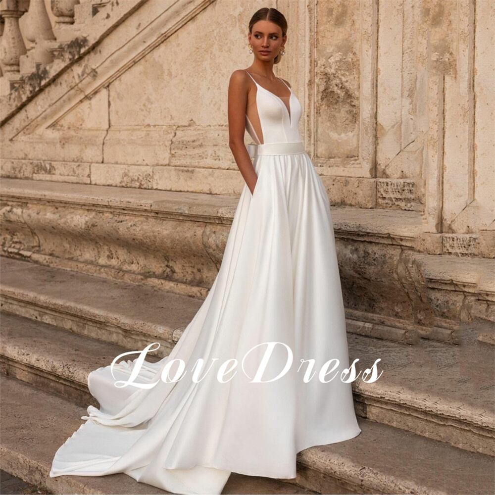 愛-弓付きのエレガントな結婚式のドレス,スパゲッティストラップ,Vネック,フロントの長さ,オープンバック,ノースリーブ