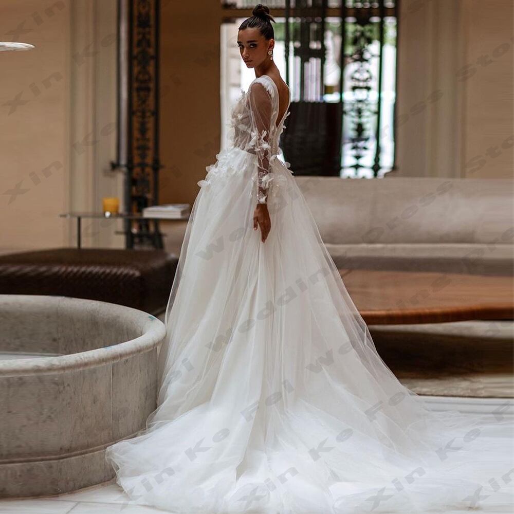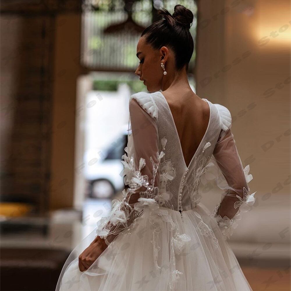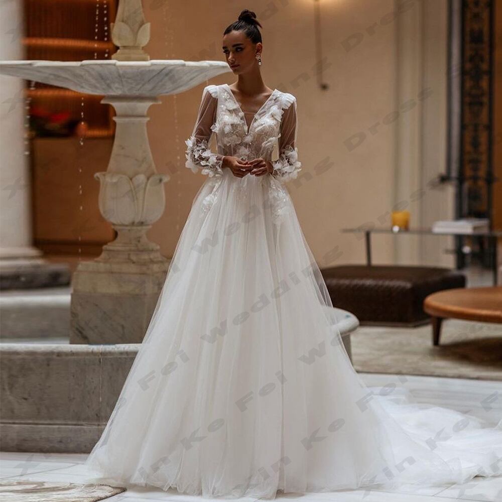 女性のVネックブライダルガウン、Aライン、長袖、レースアップリケ、プリンセスボール、ウェディングドレス、きらめく、フォーマル、ビーチパーティー、セクシ