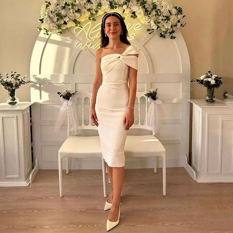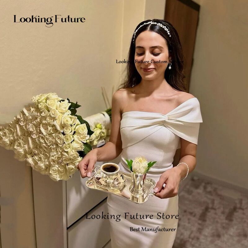 シンプルサテンストラップレスの人魚のウェディングドレス、裸の肩の弓プリーツ、背中の開いたブライダルガウン、ミッドカーフバックレスのドレス