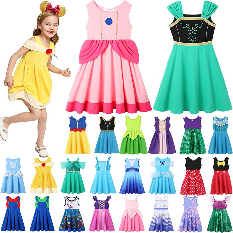 女の子のための膝丈ベストドレス,コットン,サンドレス,ロールプレイウェア,プリンセススタイル,エルザ,アンナ,アリエル,ラプンツェル,幼児,夏,202