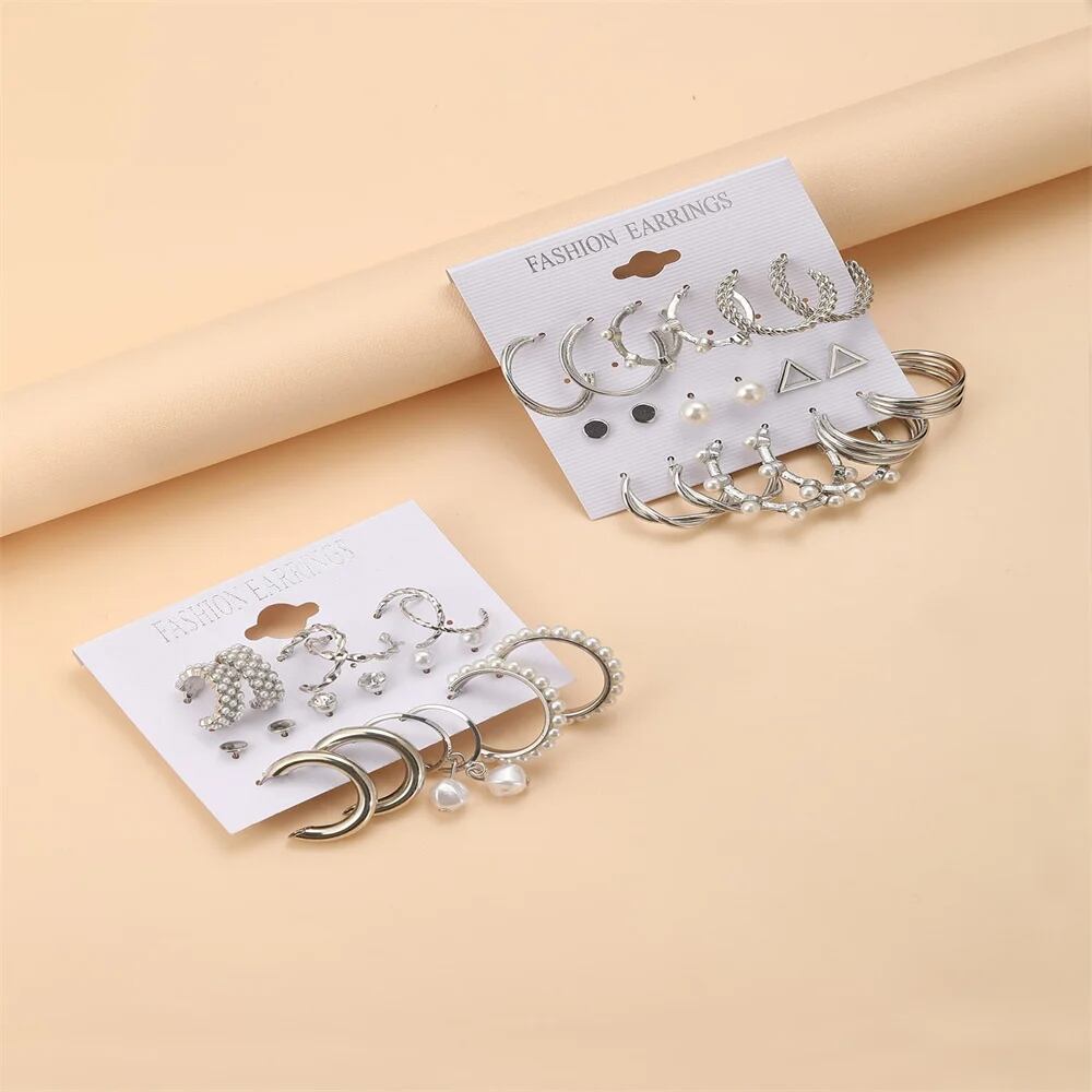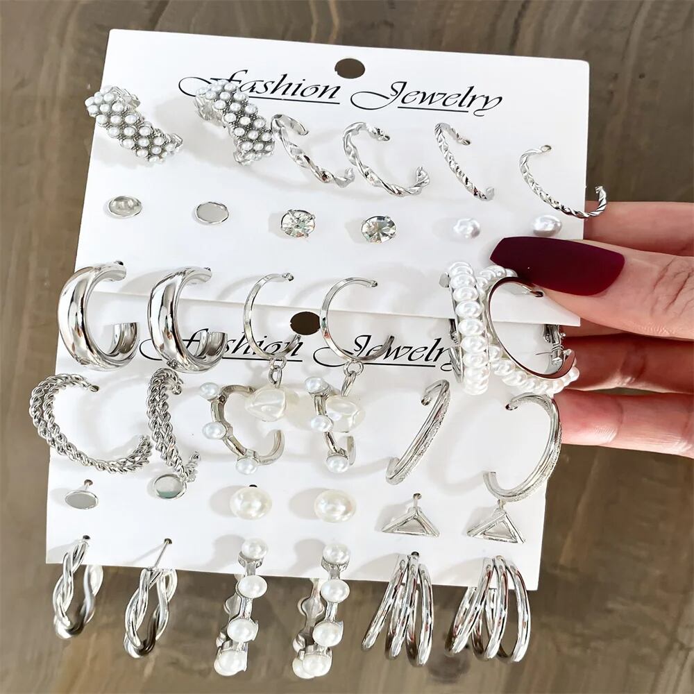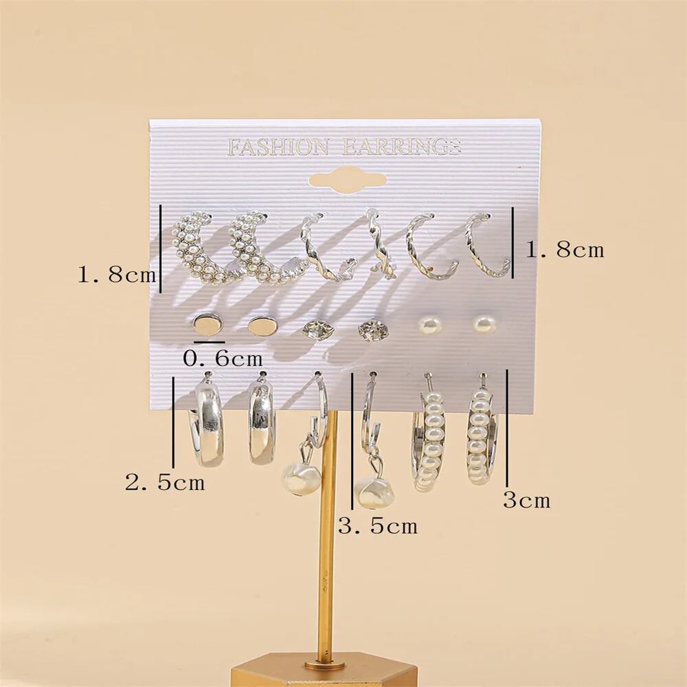 ツイストフープイヤリングセット,女性用,ヴィンテージメタル,幾何学的,シルバーカラー,ハート,パール,トレンディなジュエリー,2024