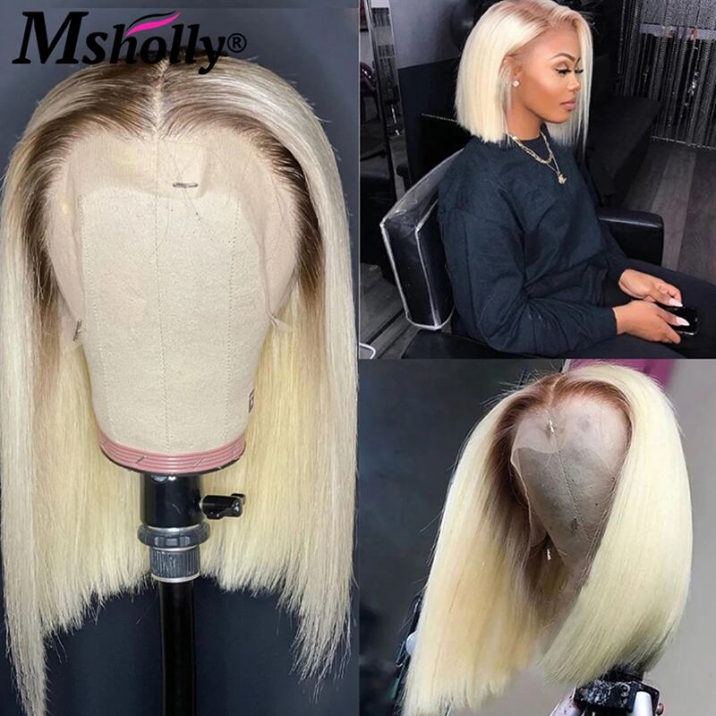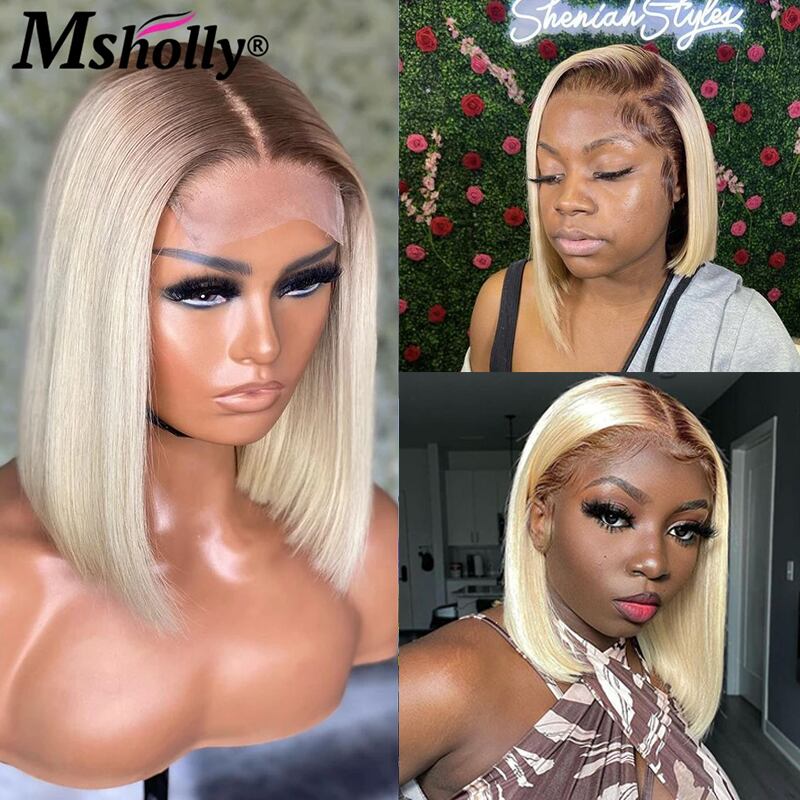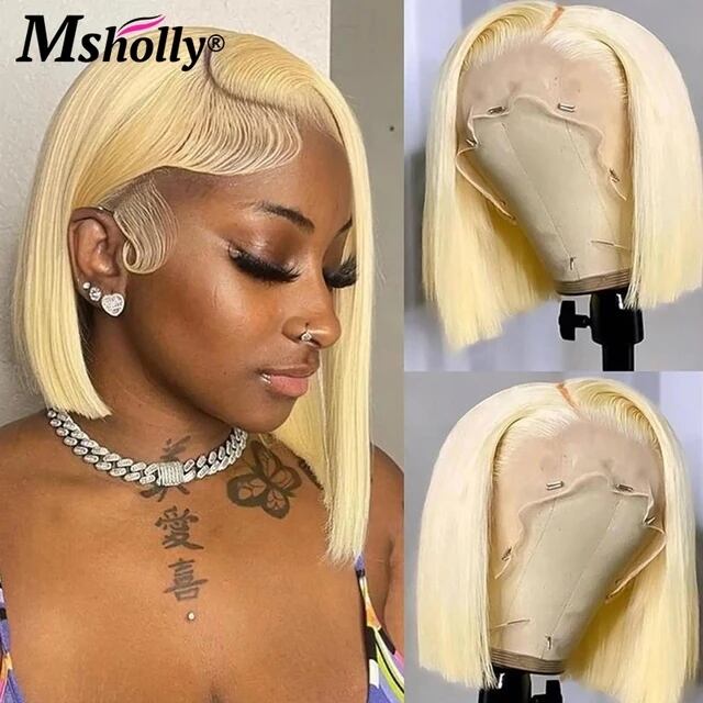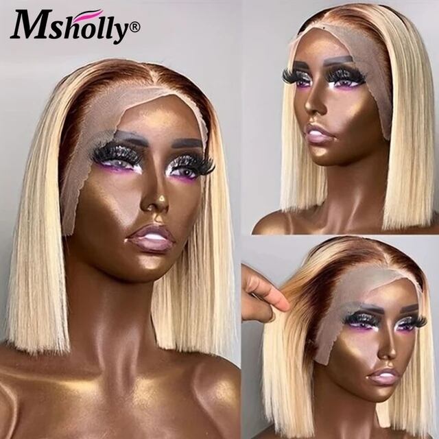 透明なレースのフロントが付いた短いボブウィッグ,ナチュラルレミーの人間の髪の毛,ブロンド,蜂蜜,13x4,4t613