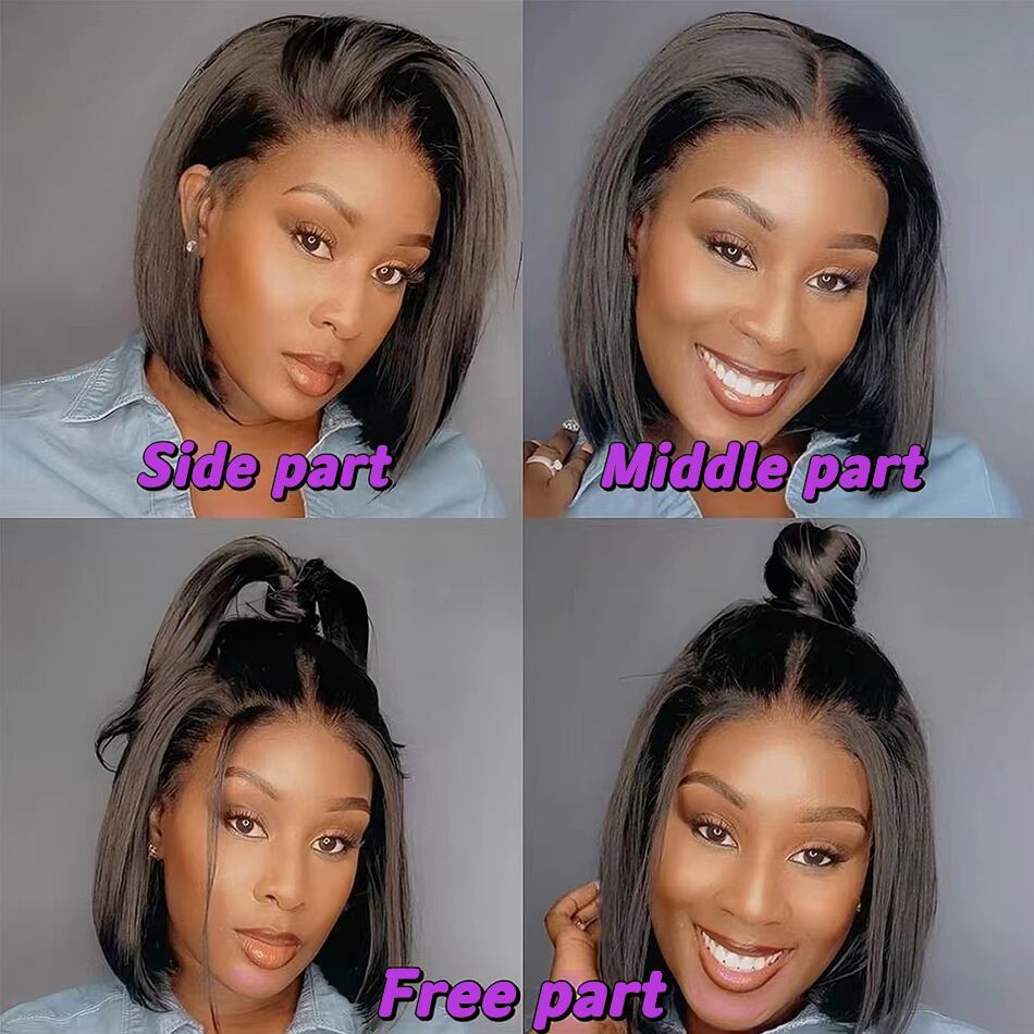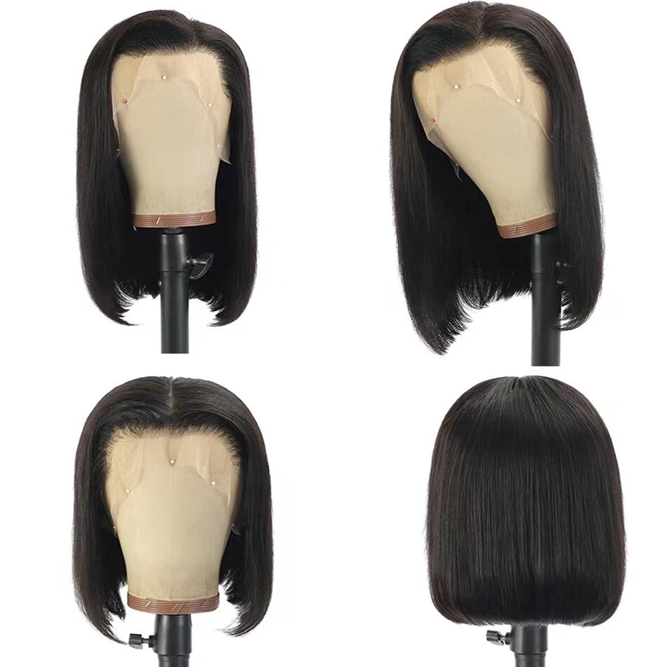 ブラジリアンストレートショートボブウィッグ女性用、透明レースフロント、人間の髪の毛、接着剤なし、行く準備ができています、13x4