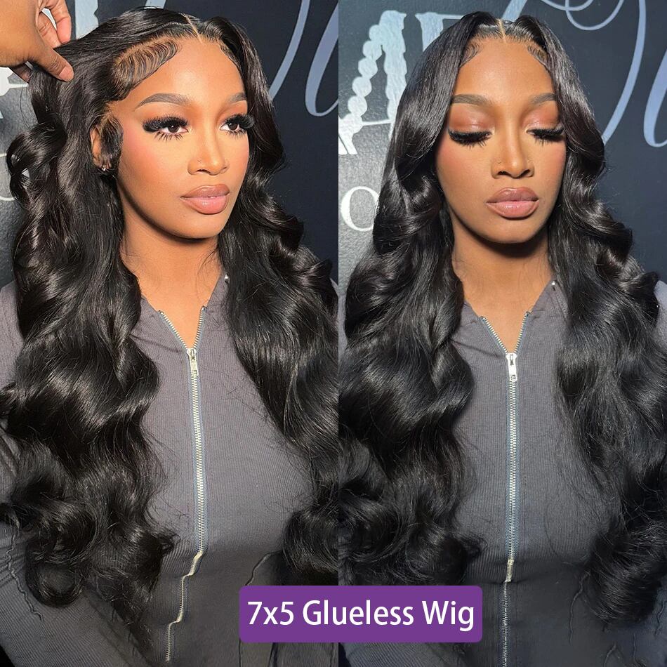 女性のためのボディウェーブ接着剤なしウィッグ、プレカット、人間の髪の毛、事前に摘み取られたヘアライン、レースフロント、漂白ノット、13x4、7x5