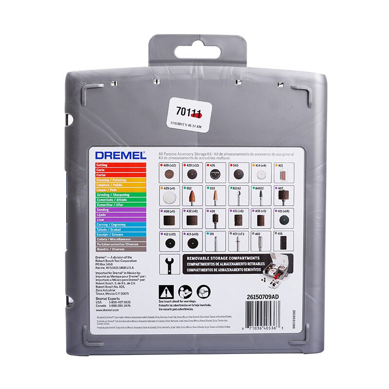 アクセサリーセットには、含まれているビットを簡単に整理できるように、再利用可能な収納ビンとリフトアウトトレイが含まれていますカービング/彫刻アクセサリー:194カービングビット(x1)研削/研ぎアクセサリー:952酸化アルミニウム砥石(x1)、953酸化アルミニウム砥石(x1)、83142炭化シリコン砥石(x1)、84922炭化シリコン砥石(x1)カッティングアクセサリー:40915/16"薄型カットオフホイール(x12)、42015/16"カットオフホイール(x12)、4261-1/4"グラスファイバー強化カットオフホイール(x1)、5401-1/4"カットオフホイール(x1)クリーニングと研磨:414¼"フェルト研磨ホイール(x4)、421研磨コンパウンド(x1)、4291"フェルト研磨ホイール(x4)サンディング:407½"バンド&マンドレル(1)、408½"バンド(6)、4321/2"バンド(6)、4301/4"サンディングバンド&マンドレル(1)、4381/4"サンディングバンド(5)、4113/4"サンディングディスク(4)、4123/4"サンディングディスク(13)、4133/4"サンディングディスク(13)Dremelはa.jによって1932に設立されました。