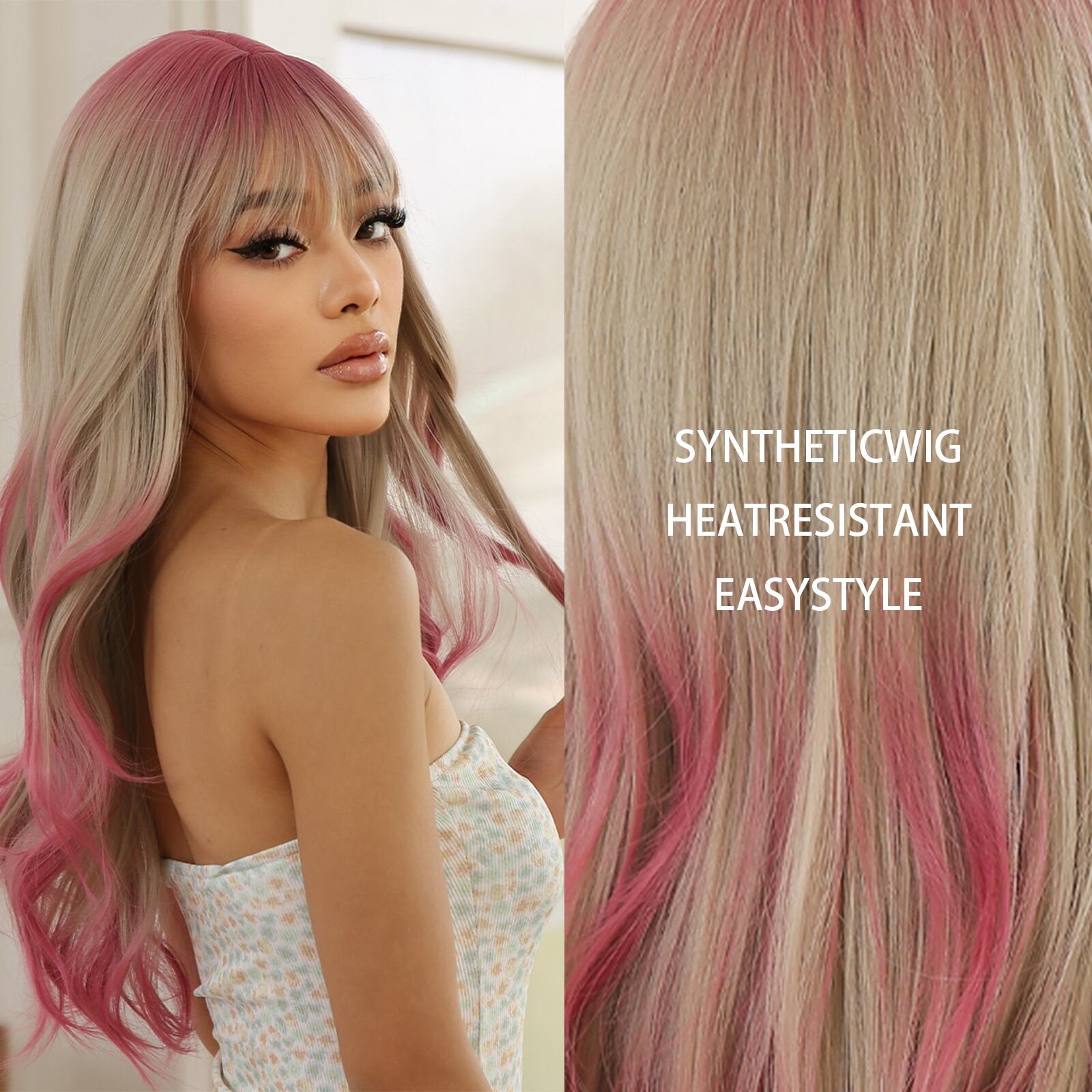"個性溢れるスタイルを手に入れて、毎日がもっと楽しくなる!前髪のある金髪オンブルピンクのウィッグで、自信を取り戻しませんか?明るく快適な素材で、学校や仕事、イベント、アウトドアまで幅広く活躍します。高品質な素材と職人技で、光沢があり自然な仕上がり。スタイリング自在のロングウェーブで、魅力と自信を引き立てます。不明点はお気軽にお問い合わせください。あなたの魅力をぐっと引き立てる、このウィッグをぜひお試しください!"【個性的なスタイル】前髪のある金髪のオンブルピンクのウィッグは自信を持ってあなたにすることができます。