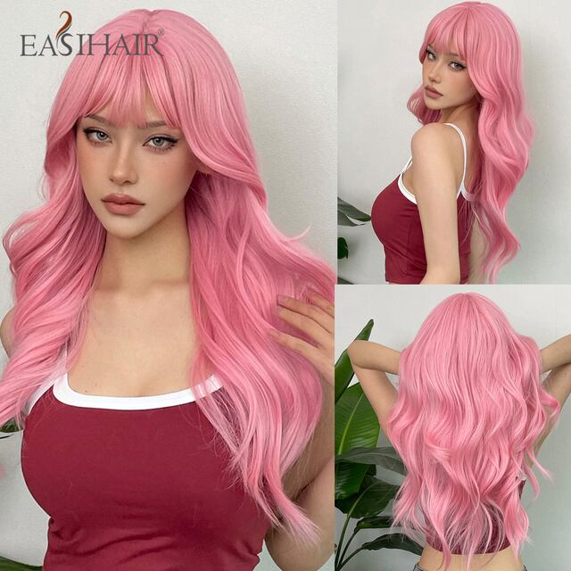 女性のためのフリンジ付きロングウェーブ合成ウィッグ、コスプレヘア、カーリロリータウィッグ、グレー、ラッシュ、ブロンド、ピンク、スイープ、毎日