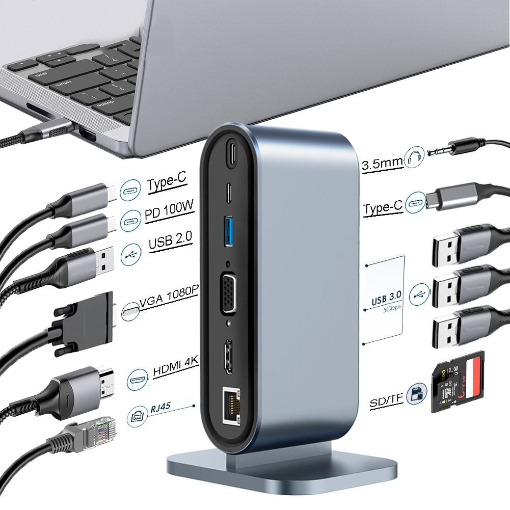 「映像も音声もこれ一本で楽しめる、USB-Cドッキングステーションの登場!最大100Wの急速充電でスマートにデバイスを充電しながら、鮮やかな4K映像を楽しめます。さらに、有線接続でWi-Fiのストレスから解放され、100Mbpsの驚異的なネットワーク速度でスムーズな作業が可能です。数秒で大容量ファイルの転送もサポート。一つで12種類のインターフェイスを活用できる便利なアイテムです。」12-in-1HD-MIモデル:HDMI互換,*1usb3.0*3usb2.0pd100wvgatfsdtypec*2100mrj453.5mm=================================================================仕様:ネットワークポート:100mbpsrj45ネットワークポートUsb3.0*3:5gbpsUsb2.0:480mbpsTYPE-C*2:高速データ伝送Vga:1080pHdmi互換:4k30hzPd3.0充電:最大100wAudio:オーディオインターフェイス3.5mmデュアルカードスロット:sd/tfパッケージが含まれています:1*12-in-1ドッキングステーション===========================================================急速充電と電力供給ドッキングステーションは、電力を最大100ワットに到達させ、接続された電子機器を充電します。