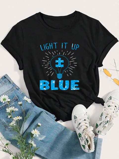 自閉症パズル付き女性用半袖Tシャツ、ライトアップブルーカラー