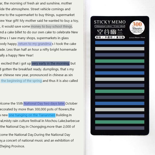 「色と透明度が美しい300枚の自己粘着付箋、透過性ノート。マーキングも分類も、これ1枚でスムーズに!繰り返し使えて、簡単に剥がせるから紙もキレイ。データ整理や重要事項の強調に最適。水性ペンで書く際はお気をつけて。店舗購入も可能!お客様のご要望に柔軟にお応えします。」Name:付箋色と素材:半透明のペットの色使い方:皮をむいて貼り付けるシートサイズ:0.4*5cm(ペースト領域:0.4*2.5cm)シングルパッケージ仕様:300枚(5色*20枚*3グループ)/パック機能と用途:1枚のボードに複数の色があり、より明確なマーキングと分類が可能です。
