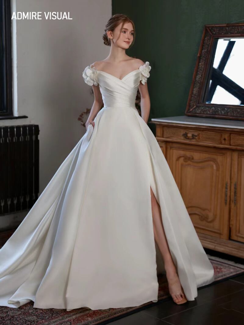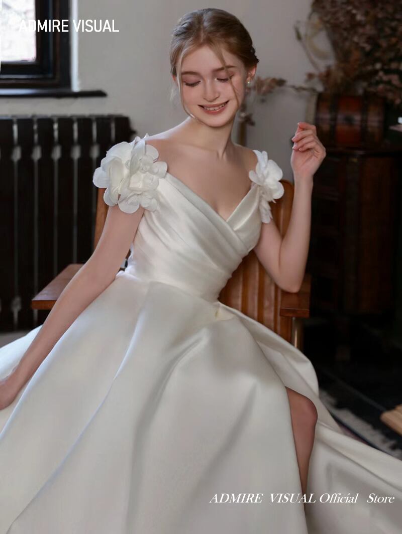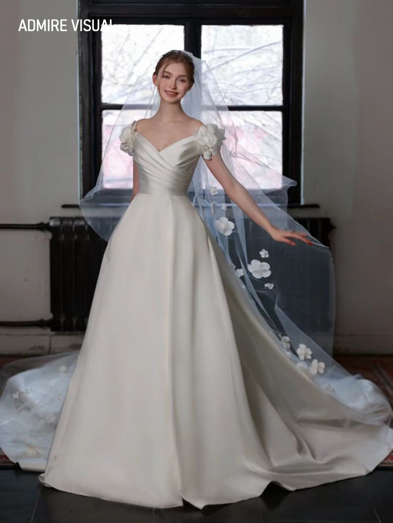 A-サテンのウェディングドレス,Vネック,カスタムメイド,ラージサイズ,3D花付き,2024