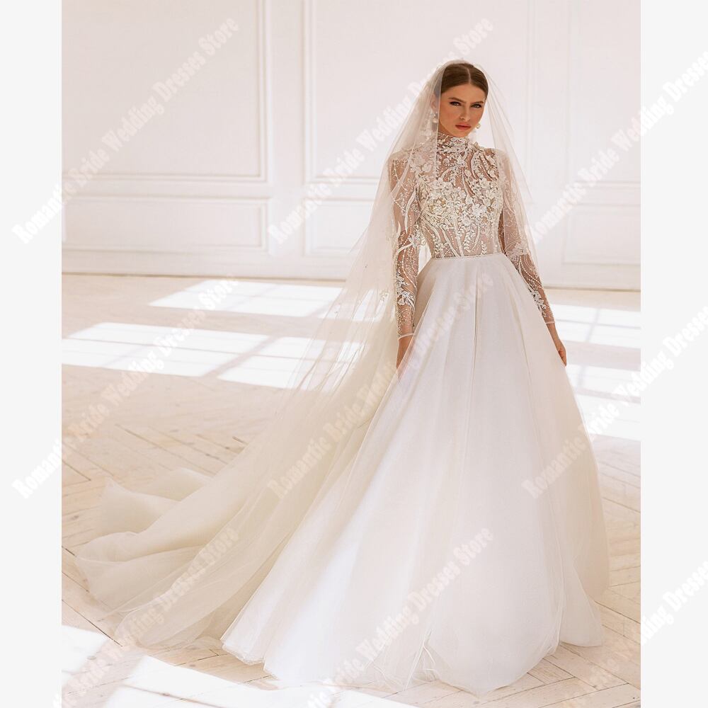 チュールのウェディングドレス,高品質のセクシーなロングドレス,ハイカラー,ミニマリストスタイル,袖付き,家庭用,パーティー用,2024
