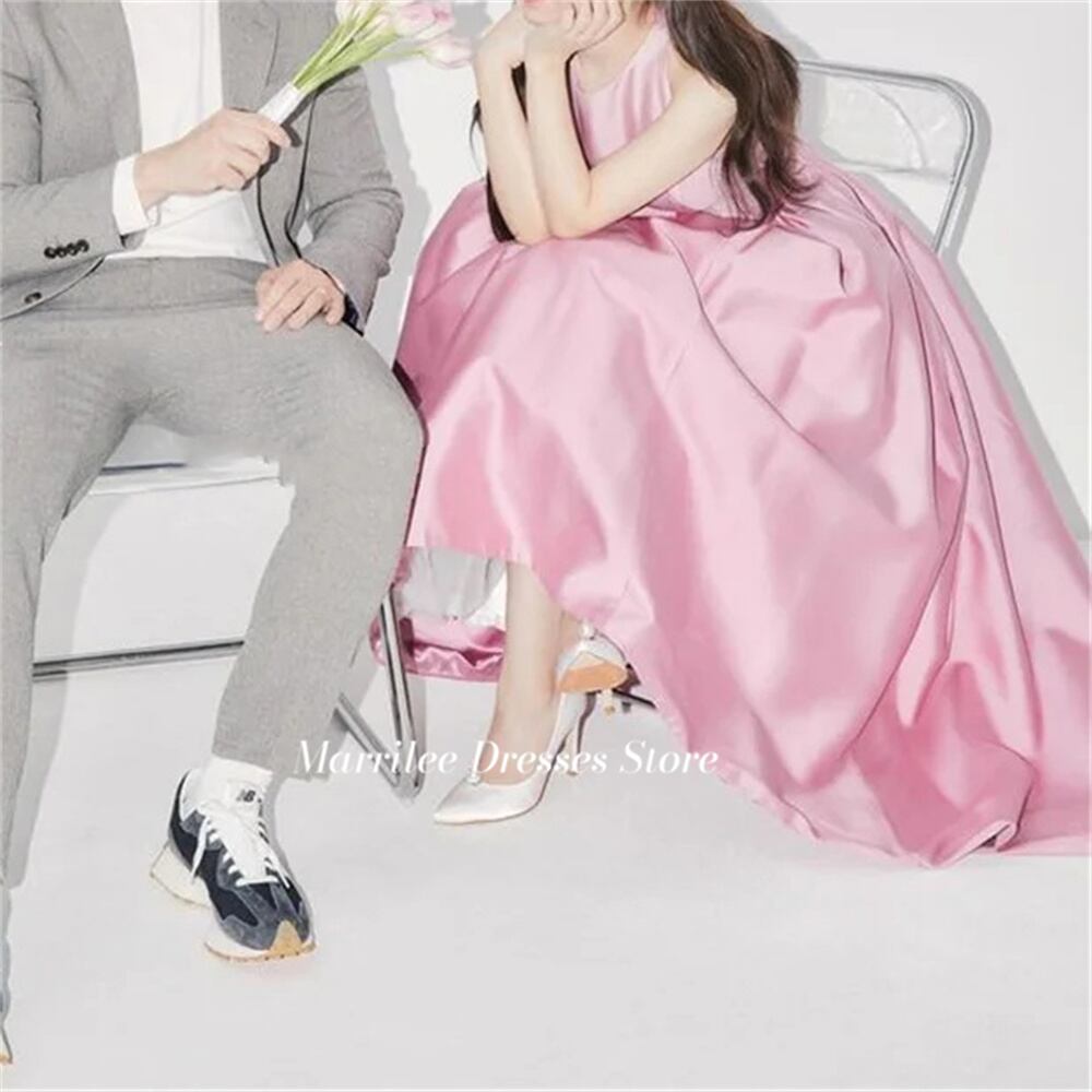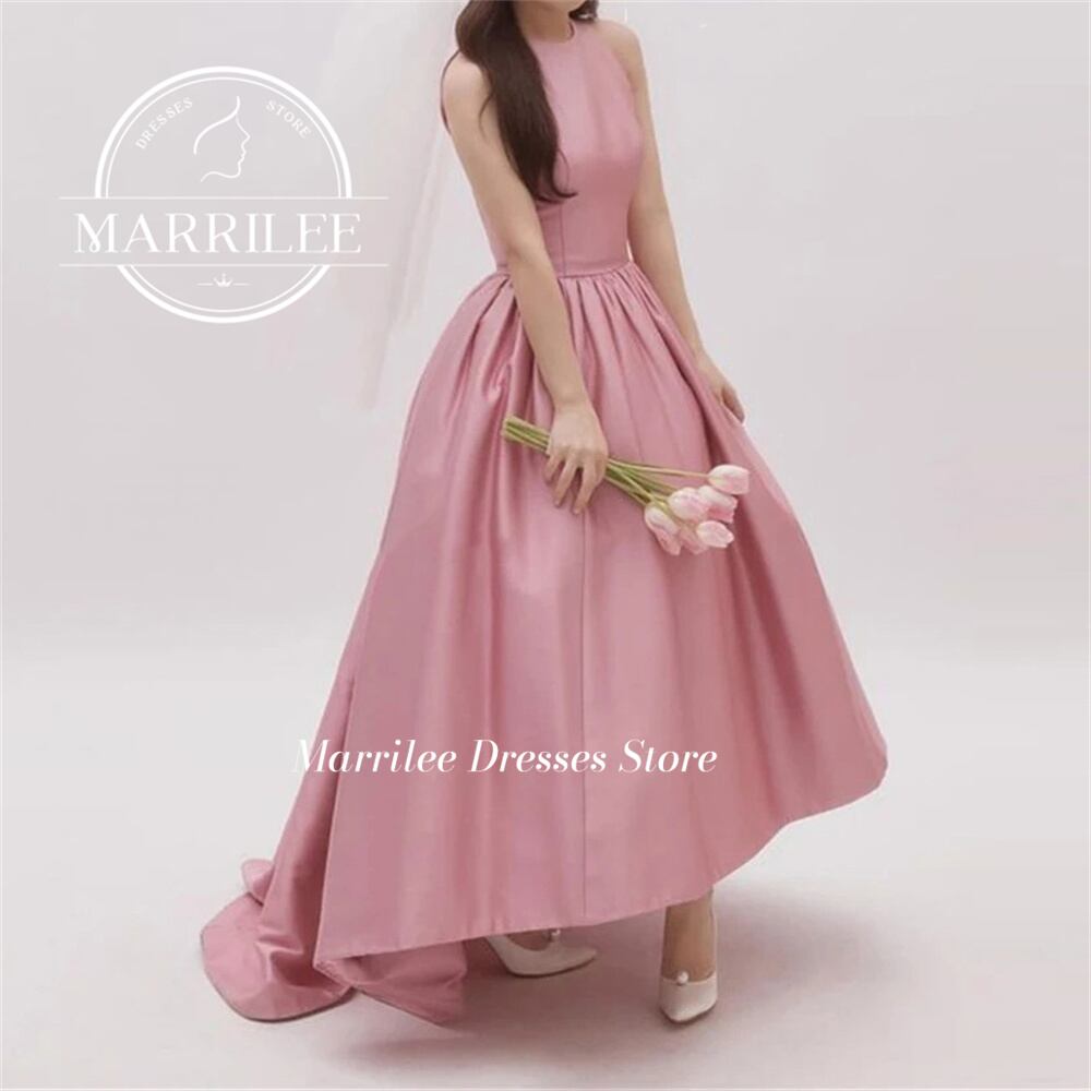 マリリー-ピンクのハイステインイブニングドレス、Aラインドレス、ラウンドネック、床の長さ、ノースリーブ、プリーツ、シンプルなプロムパーティードレス、エ