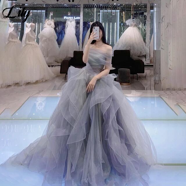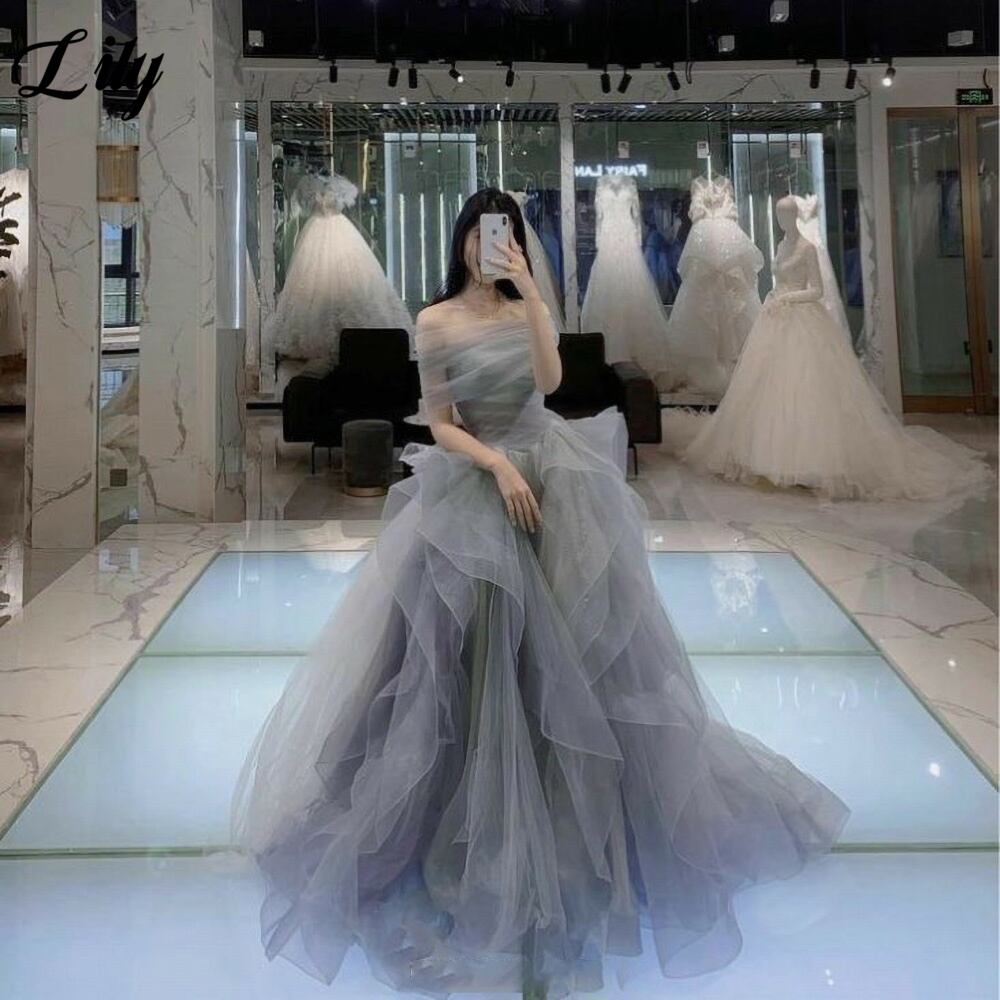 特別なシーンのためのlilyグレーのチュールイブニングドレス、レイヤー、スタイル、特別なシーンのための裸の肩のチュール服