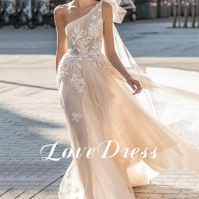 ラブ-非対称のチュールのウェディングドレス,レースのアップリケ,エレガント,シャンパンカラー,Aライン,地面の長さ,ノースリーブ