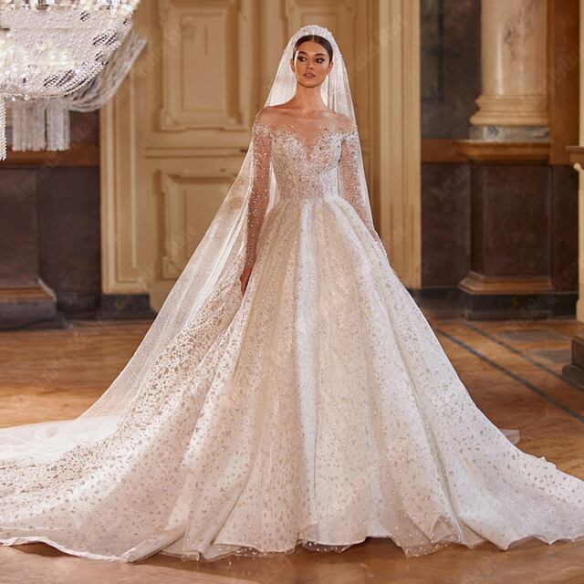 女性のための豪華なスパンコールのウェディングドレス,裸の背中と深いVネックのウェディングドレス,セクシー,長袖,プリンセスドレス,2024