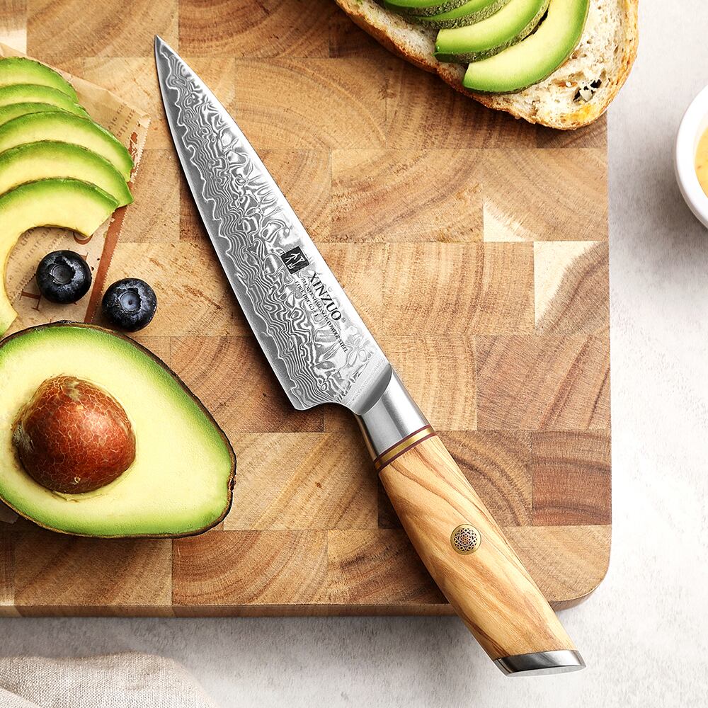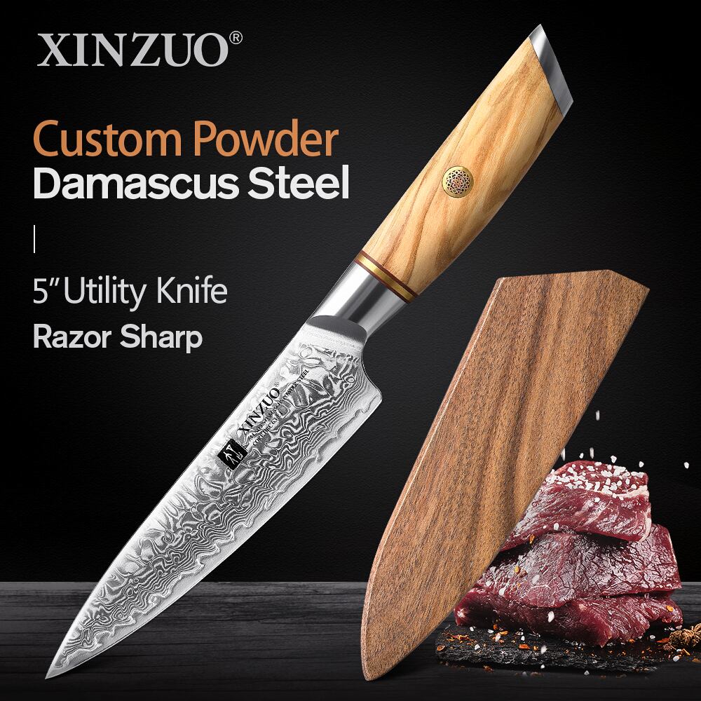 Xinzuolanシリーズダマスカス鋼ユーティリティナイフプロダクト:5インチ万能ナイフブレード素材:ダマスカス鋼コア,73層ハンドルマテリアル:高品質のオリーブの木と銅の花の爪コア硬度:62-64hrcエッジの角度:15°±1/辺表面処理:研磨処理、ハイエンドの外観特性:シャープで耐久性があり、超防錆、光エネルギーシャープネスレベル:切削力レベル:6.0-8.0n国際基準。