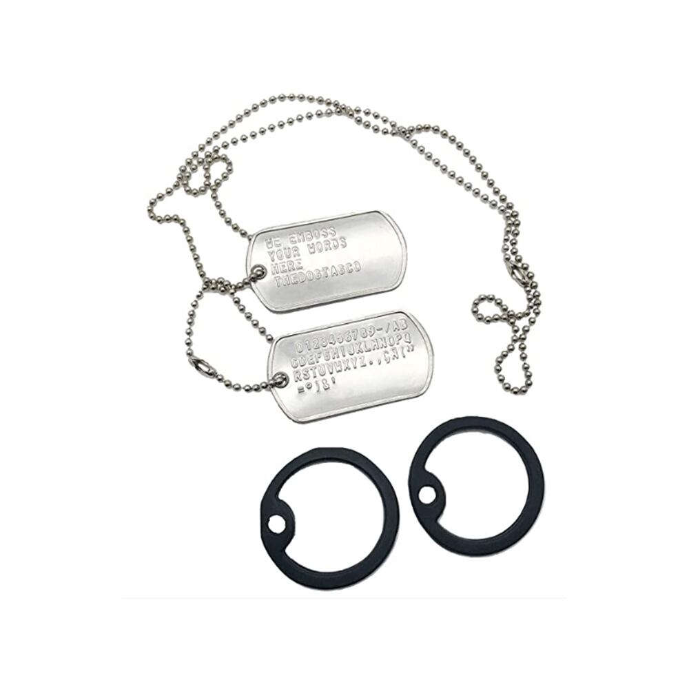 2x304グレードのステンレス鋼ロールエッジドッグタグ、1×60センチメートル&1×10センチメートル304グレードステンレス鋼チェーン2xブラックラバーサイレンサー各タグに5行のテキスト。