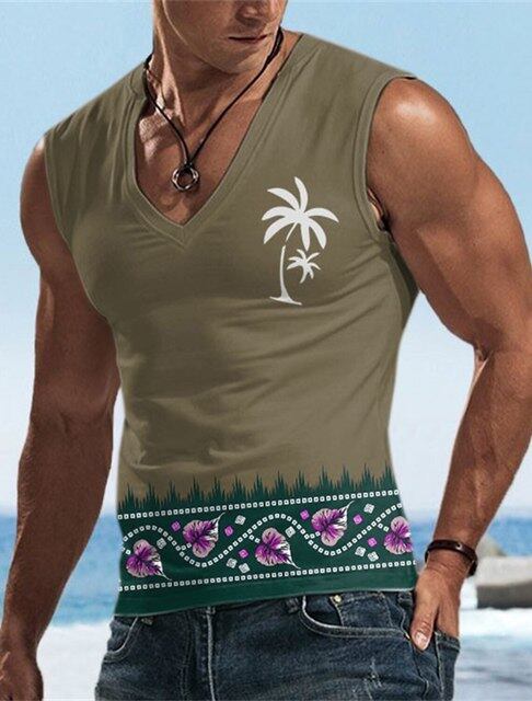 男性用ハーバーアンココナッツツリープリントノースリーブオネックタンクトップ、カジュアルビーチシャツ、男性用フィットネス服、ボディービル、2023