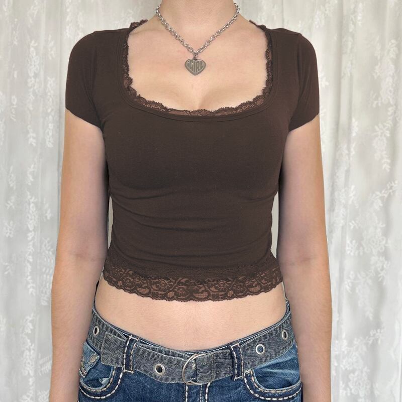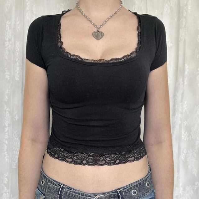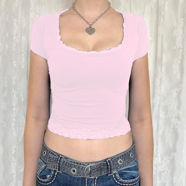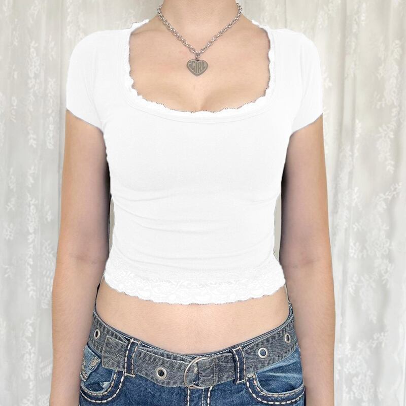 女性用レーストリムクロップトップ,半袖,ローカット,スリムフィットTシャツ,無地,ゴシックブラウス,ストリートウェア,外出,y2k