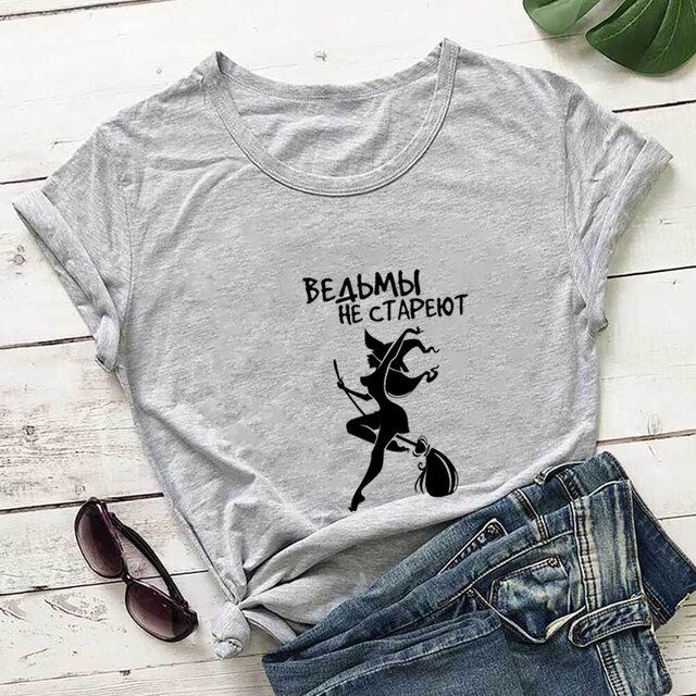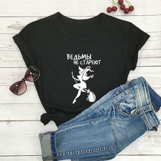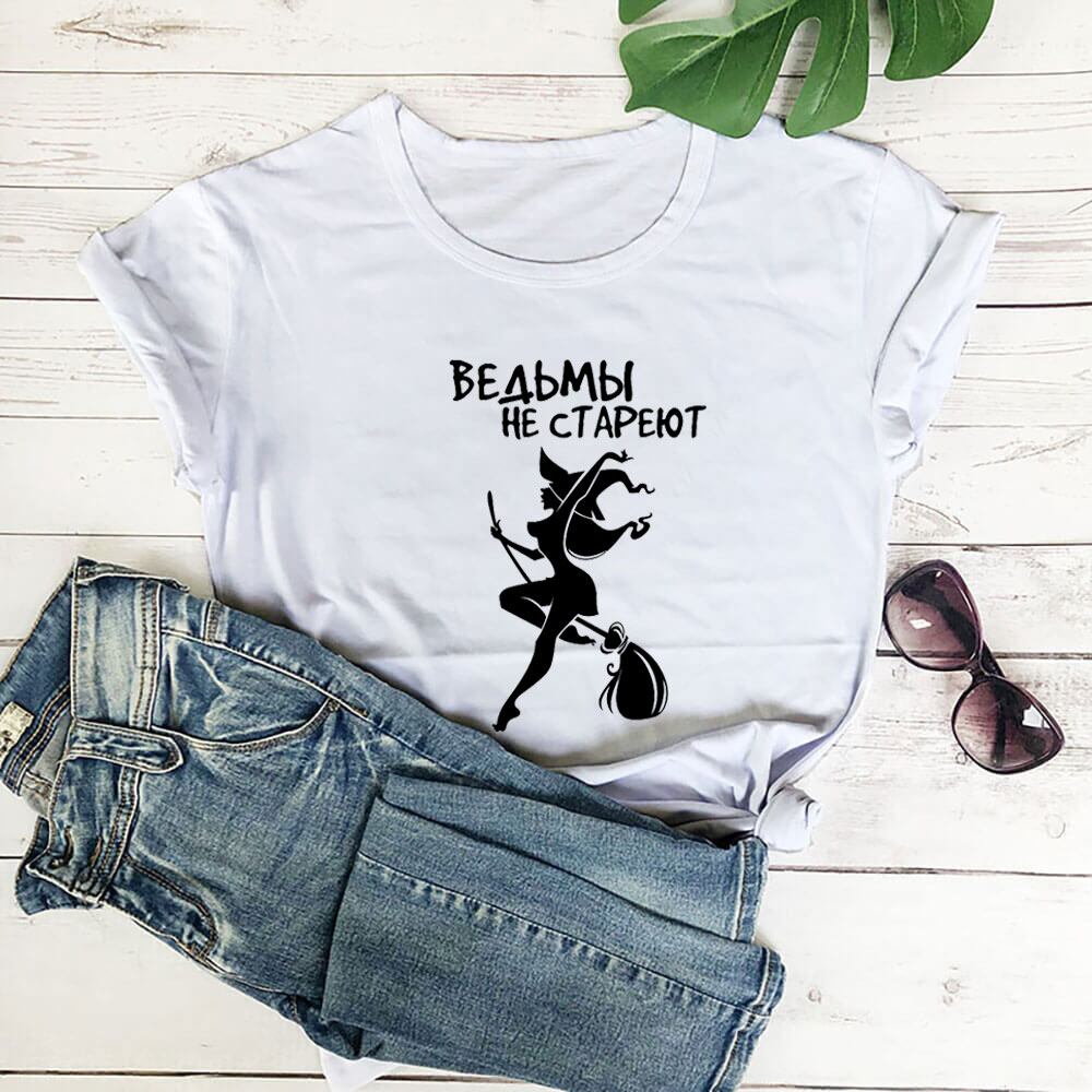 女性のためのブロムスティックイッチの絵が描かれたTシャツ,半袖,カジュアル,夏