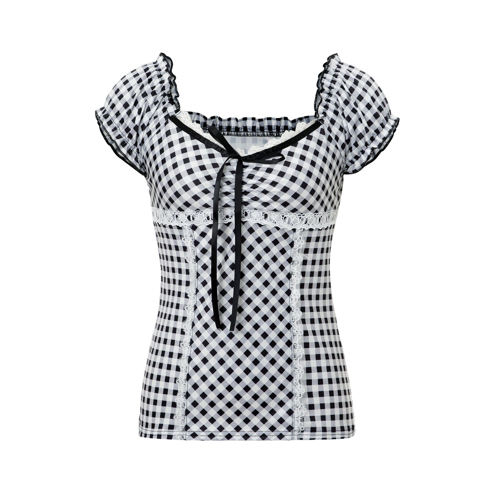 女性用スクエアネックレーストリム市松模様のプルオーバー、ヴィンテージTシャツ、y2k服、プレッピーカワイイ弓トップ、フェアリーコア、グランジ、レトロT