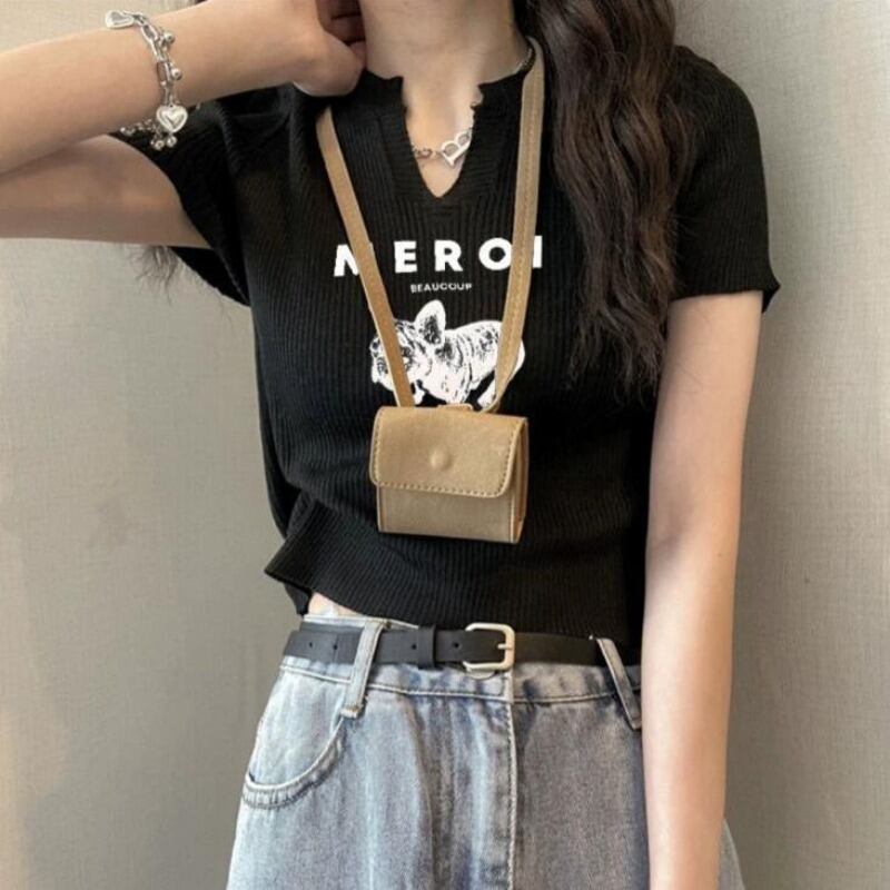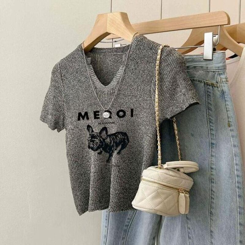女性のためのセクシーなVネックニットTシャツ,半袖Tシャツ,スリムなショートトップ,ヴィンテージの犬のプリント,ファッショナブルなデザイン,y2k,フ