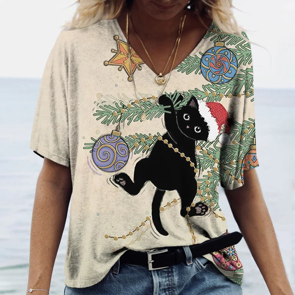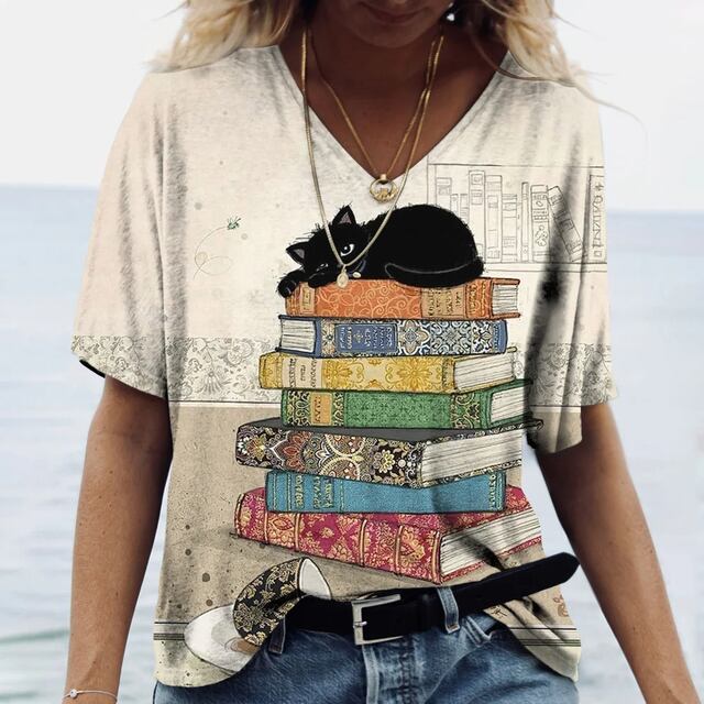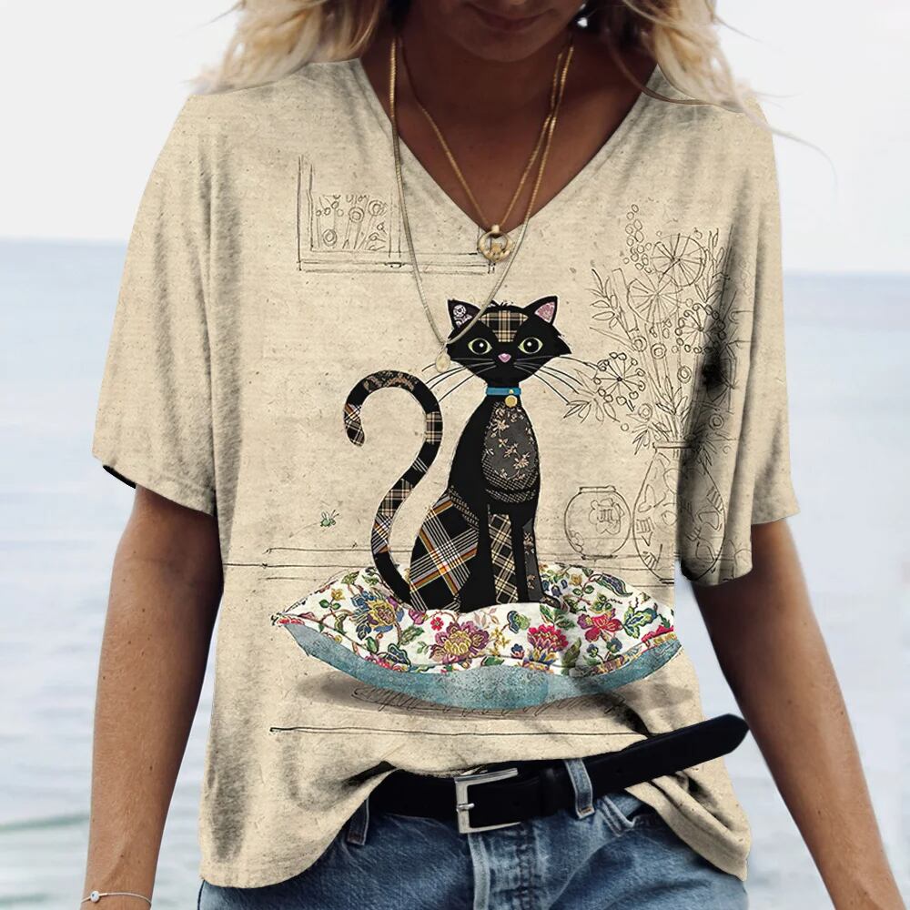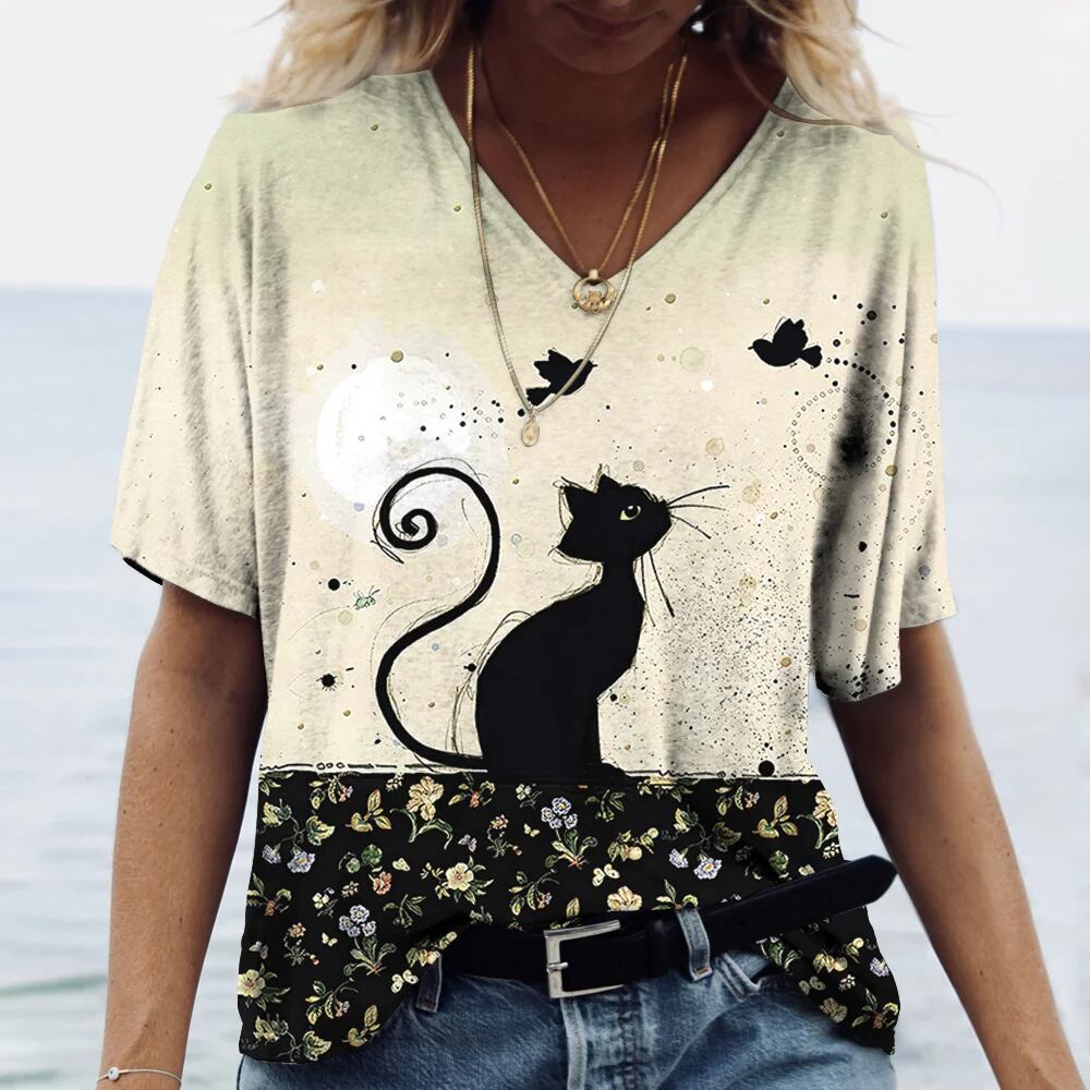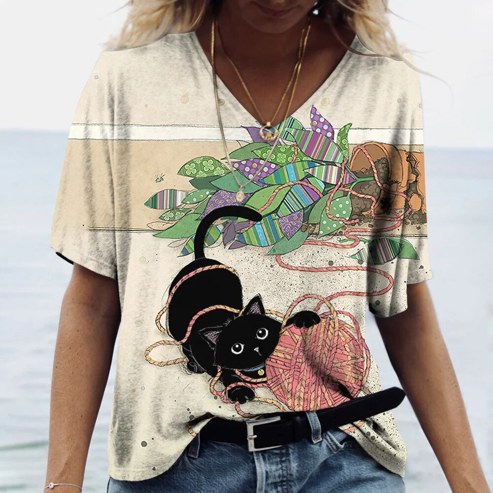 女性用Vネック半袖Tシャツ,大きいサイズの服,素敵な猫のプリントトップ,動物のプルオーバー,カジュアルな服,夏