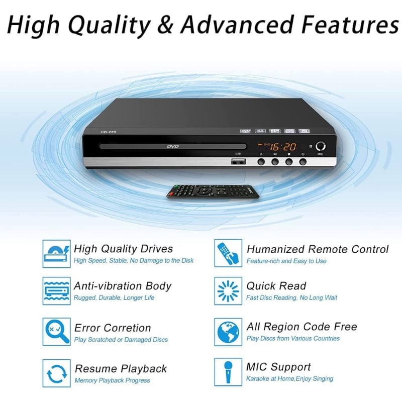 コンパクトサイズ、高速ディスク読み取り、長い待機なし、人間化されたリモートコントロールにより、DVDプレーヤーを簡単にセットアップできます。