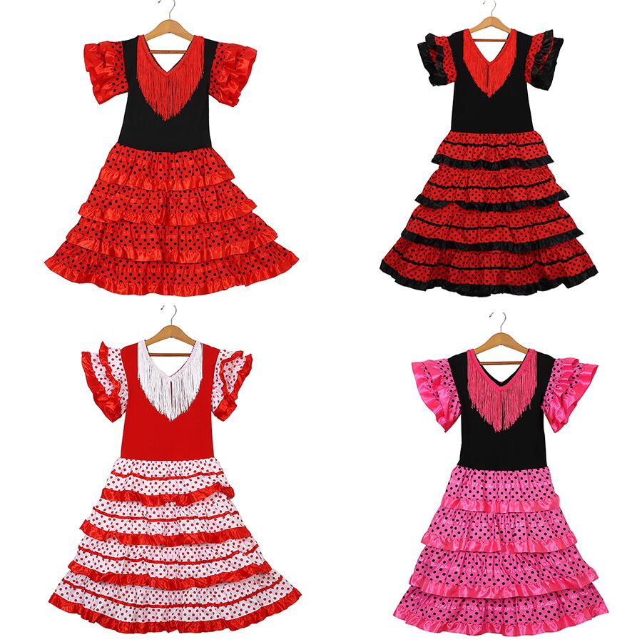 子供のためのスペインの伝統的なダンスドレス,フェスティバルのためのタッセルと水玉模様のスカート,4色のクラシックなフラメンコ,ジプシースタイル