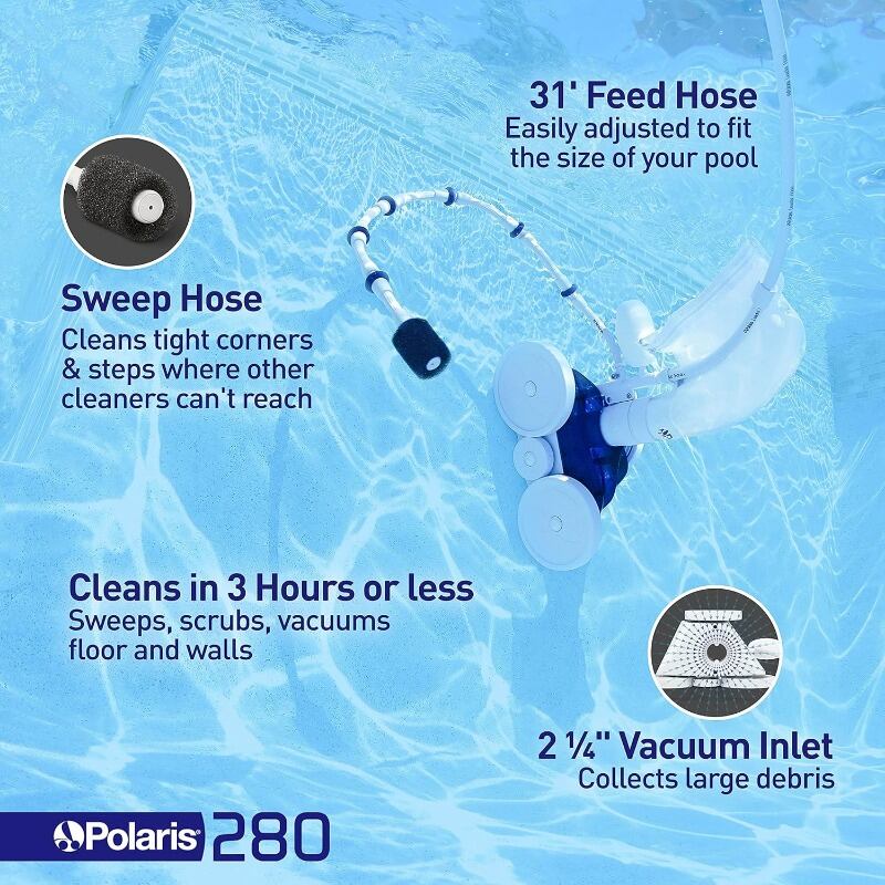 最新の偏光-vacweep 280高圧地上プールクリーナーでプール清掃を効率的に!強力な真空パワーが3時間でプールを一新。安全かつ確実にビニールやタイルなどの床と壁をスイープ&スクラブ。2.25インチの大口径口で大きな破片もラクラク。葉や小石もシングルチャンバーフィルターバッグでしっかり捕獲。vacsweep 280には31フィートのホースも付属。プールクリーニングを徹底サポート!この商品について3時間で洗浄:別のポーラリスブースターポンプを搭載したデュアルベンチュリジェットは、強力な真空パワーを生み出し、3時間以内に地面にあるプールを確実に洗浄します。