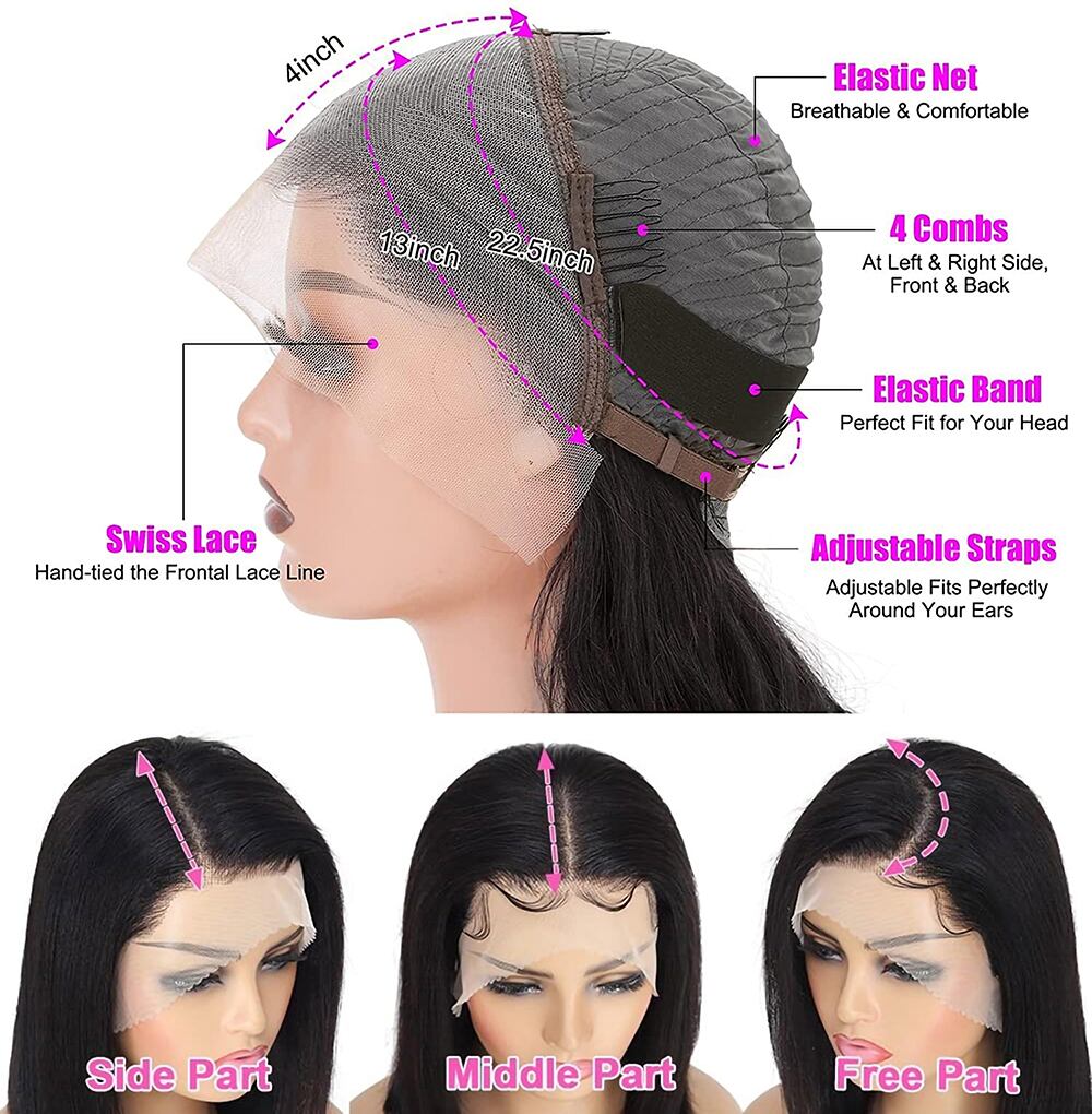 女性用ショートストレートボブウィッグ,ナチュラルヘアウィッグ,接着剤なし,密度180%,HD,12a,13x4