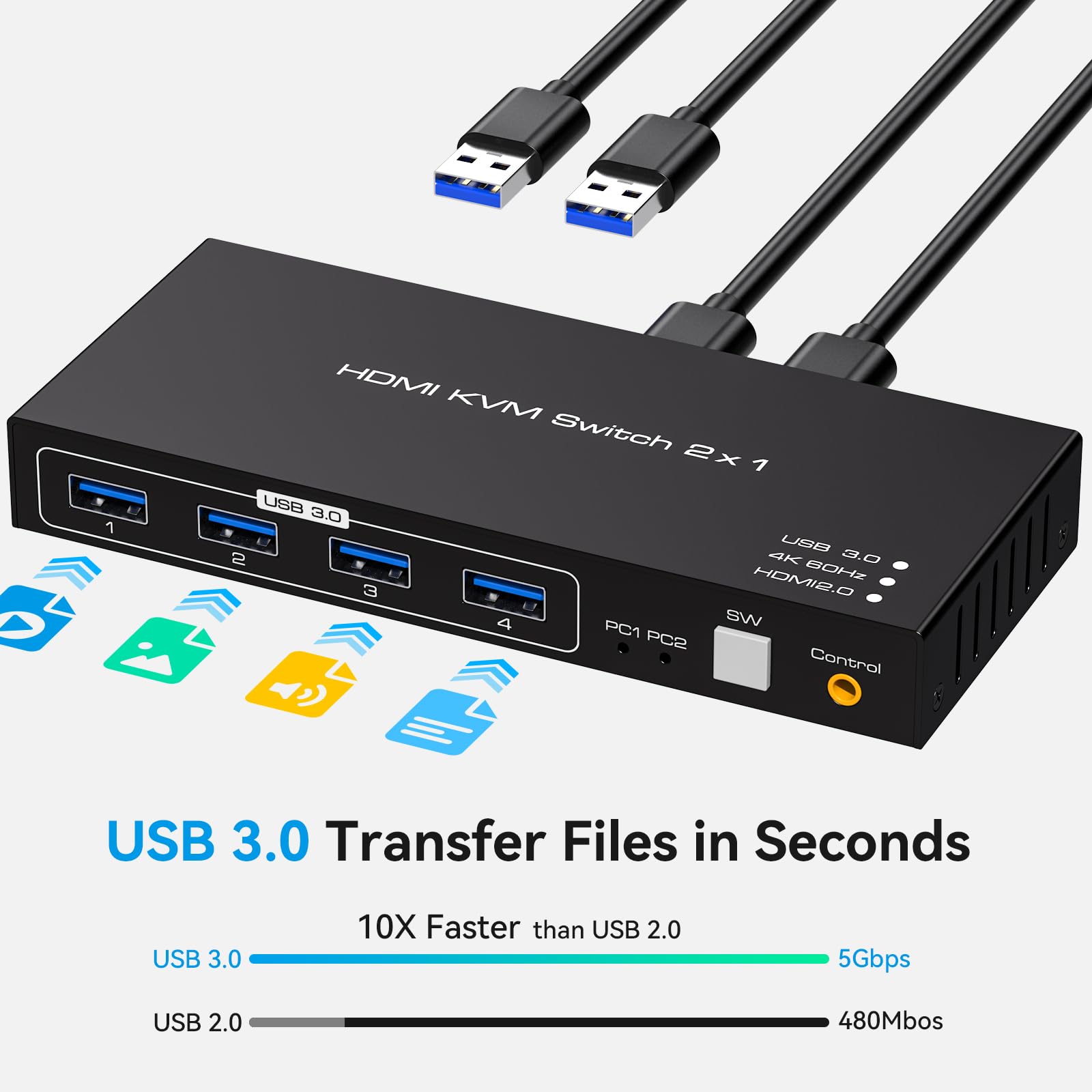 USB3.0と互換性のあるUSB2.0インターフェイス2台のコンピューターが4つのUSB3.0ポートを共有して、USB2.0の最大10倍の効率的な転送速度を実現ボタンスイッチコントロールパネルのボタンを押すだけで、簡単かつ迅速にコンピューターを切り替えることができます。