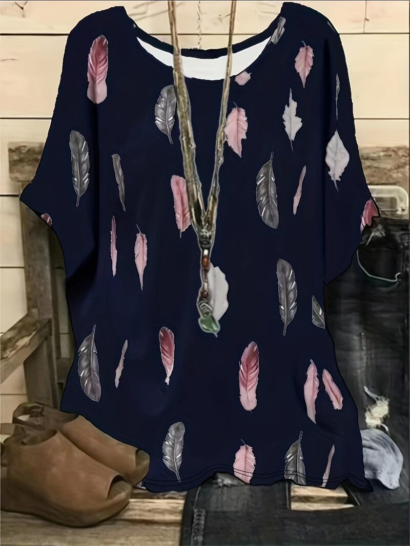 華やかなフェザープリントが施された女性用ラウンドネック半袖トップス!リラックス感満点の伸縮性で着心地抜群♪ラージサイズ1XLから5XLまで揃え、ファッショナブルに着こなせます。洗練されたスタイルを手に入れませんか?window.adminAccountId=2679840918;