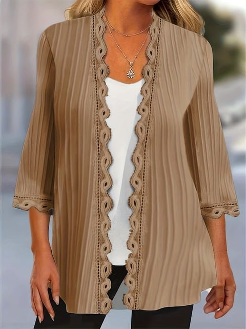 レース付きレディースリブカーディガン、七分袖、エレガントコート、単色アウター、プラスサイズ、1xl-5xl